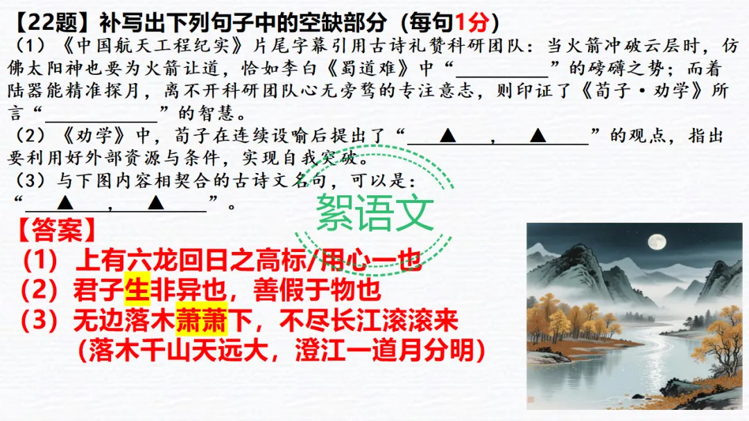 (1)《中国航天工程纪实》片尾字幕引用古诗礼赞科研团队:当火箭冲破云层时,仿佛太阳神也要为火箭让道,恰如李白《蜀道难》中“”的磅礴之势;而着陆器能精准探月,离不开科研团队心无旁骛的专注意志,则印证了《荀子·劝学》所言“”的智慧。