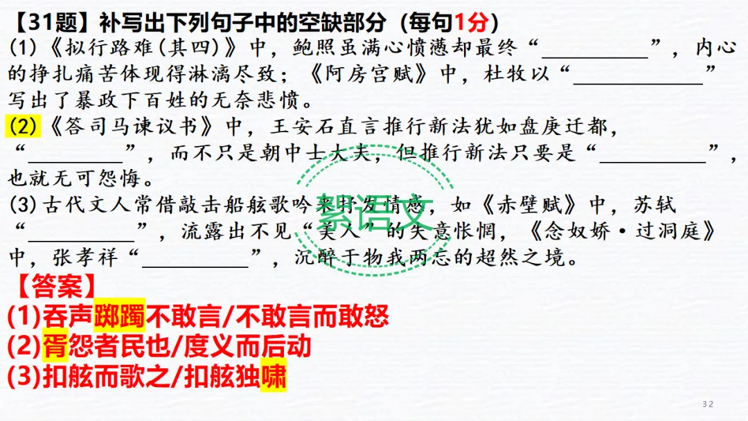 31.(1)吞声踯躅不敢言;不敢言而敢怒