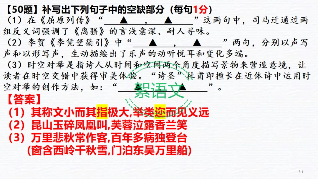 (1)语文课上,张老师列举李贺《李凭箜篌引》中“,”两句诗,引导学生赏析运用比喻和视听结合的方法摹写乐声各种变奏的技巧,提高审美意趣。