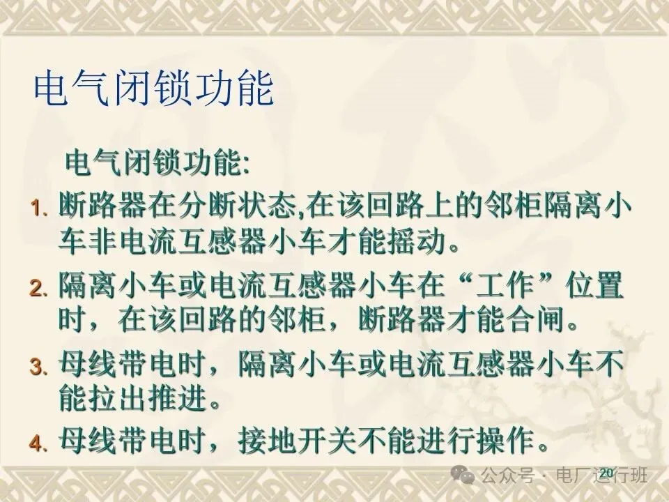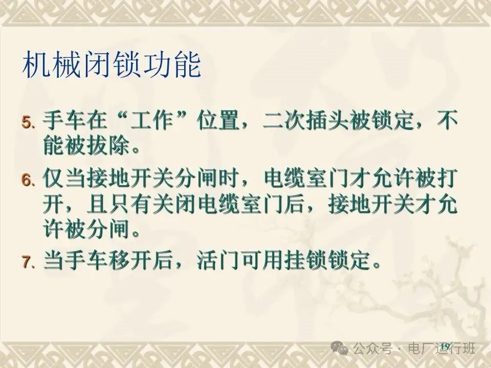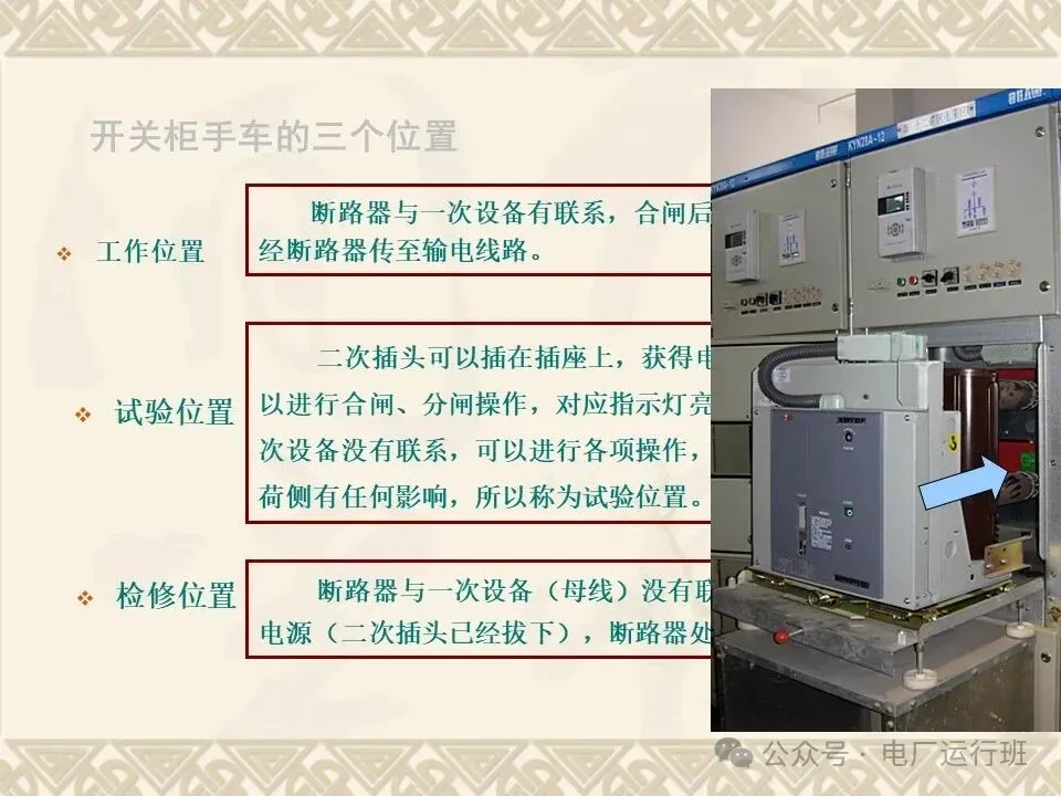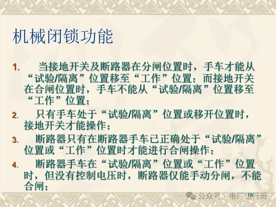 当接地开关及断路器在分闸位置时,手车才能从“试验/隔离”位置移至“工作”位置;而接地开关在合闸位置时,手车不能从“试验/隔离”位置移至“工作”位置;