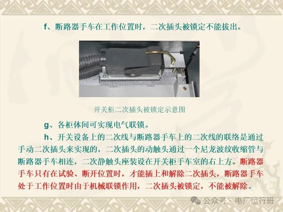手车在“工作”位置,二次插头被锁定,不能被拔除。