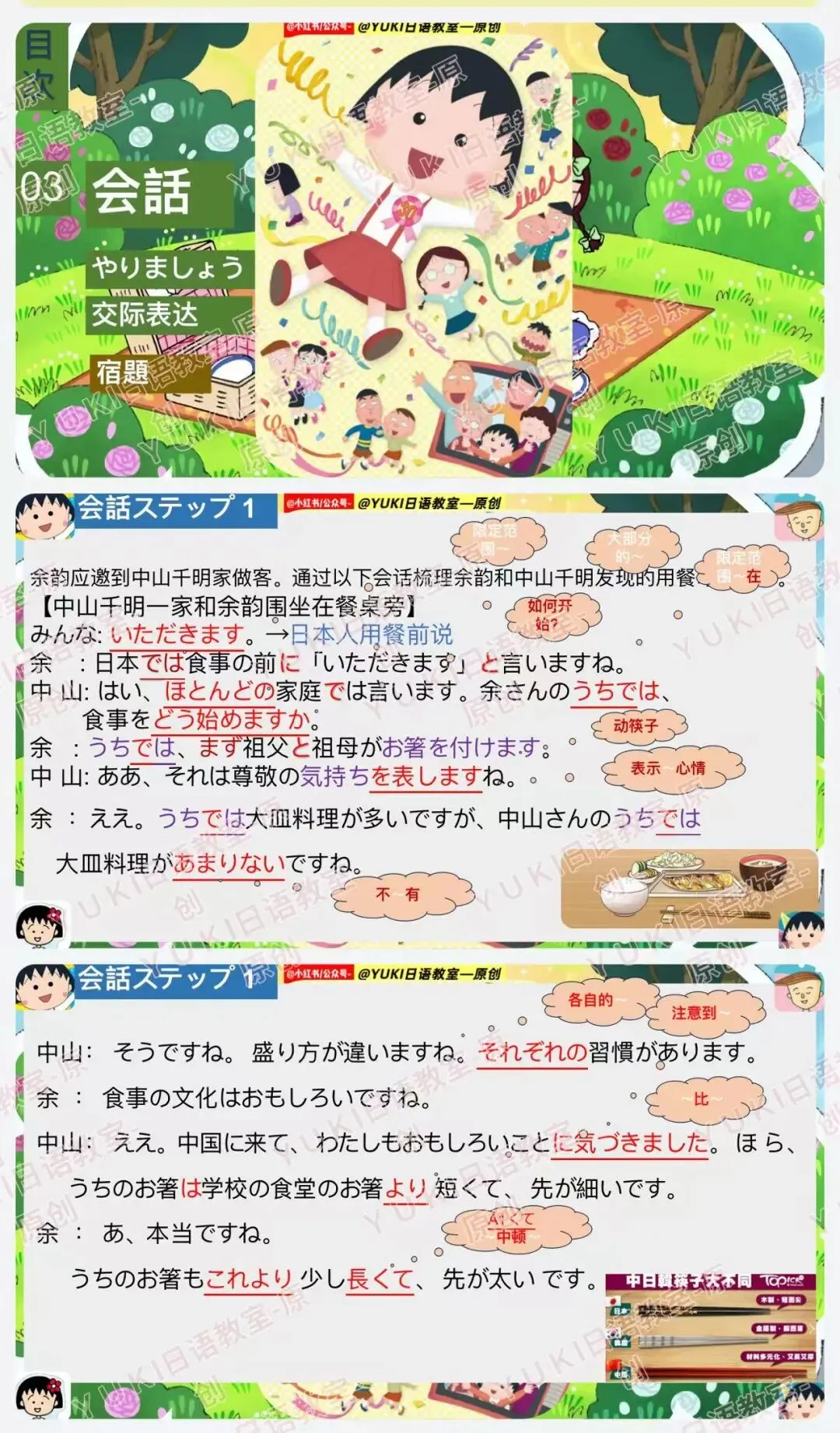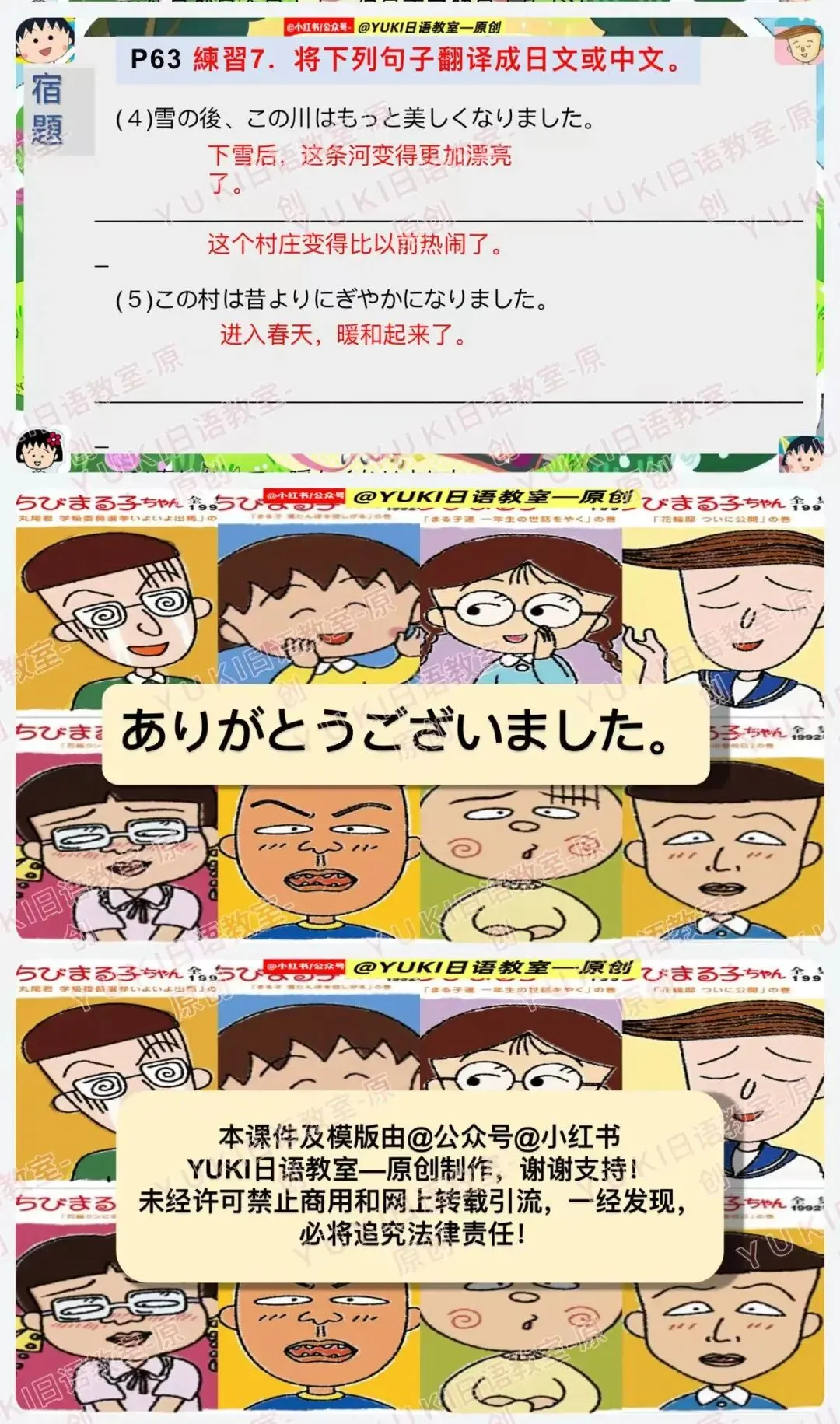新版人教日语八年级动漫版课件第4课(樱桃小丸子-原创动漫版课件:)-本课件为原创课件由-@公众号--YUKI日语教室 制作。本课件未授权给任何人进行商用,禁止🚫二次引流和销售,盗版课件属于违法侵权行为,请大家谨防假冒,谢谢支持原创日语资料的制作!