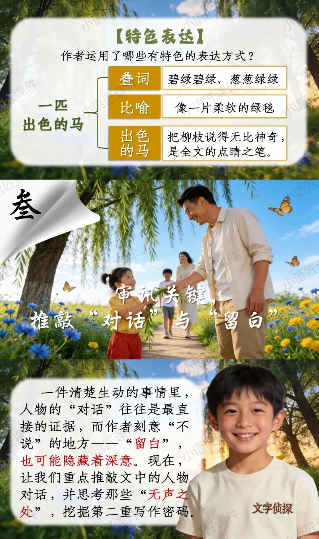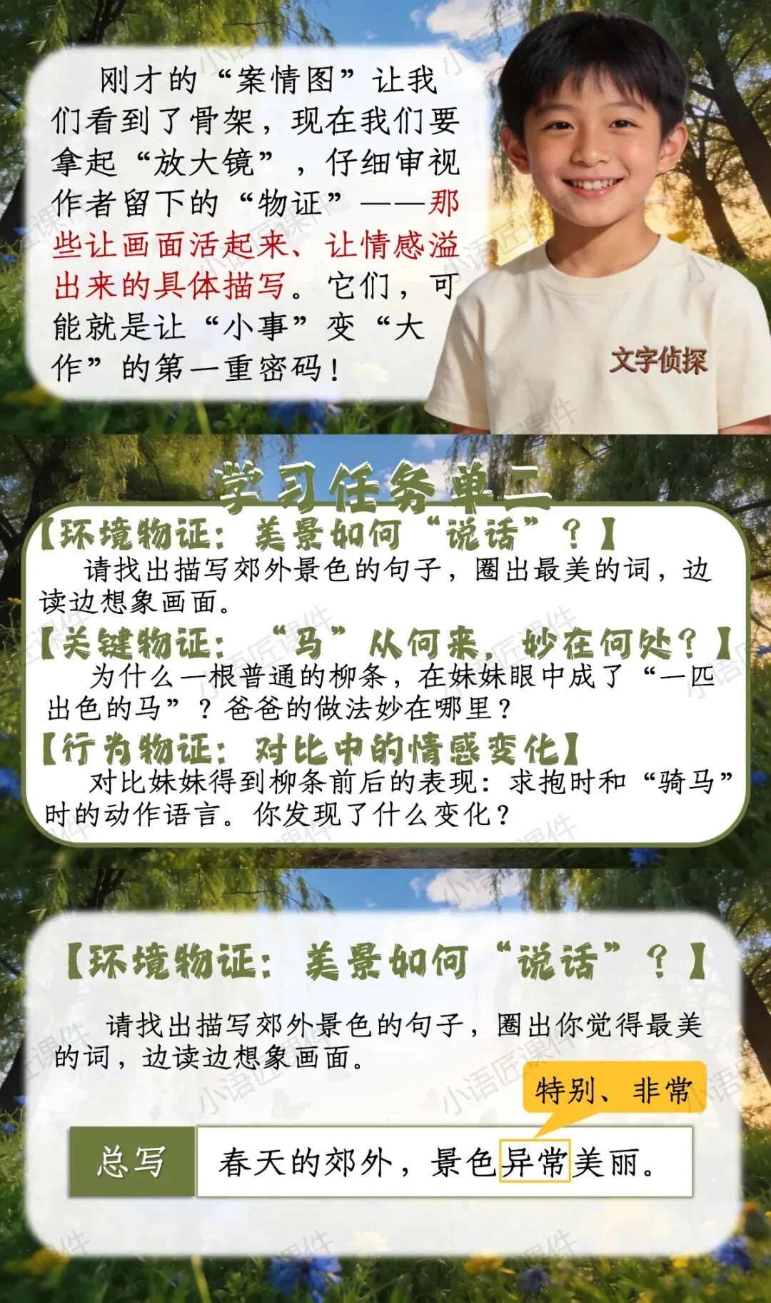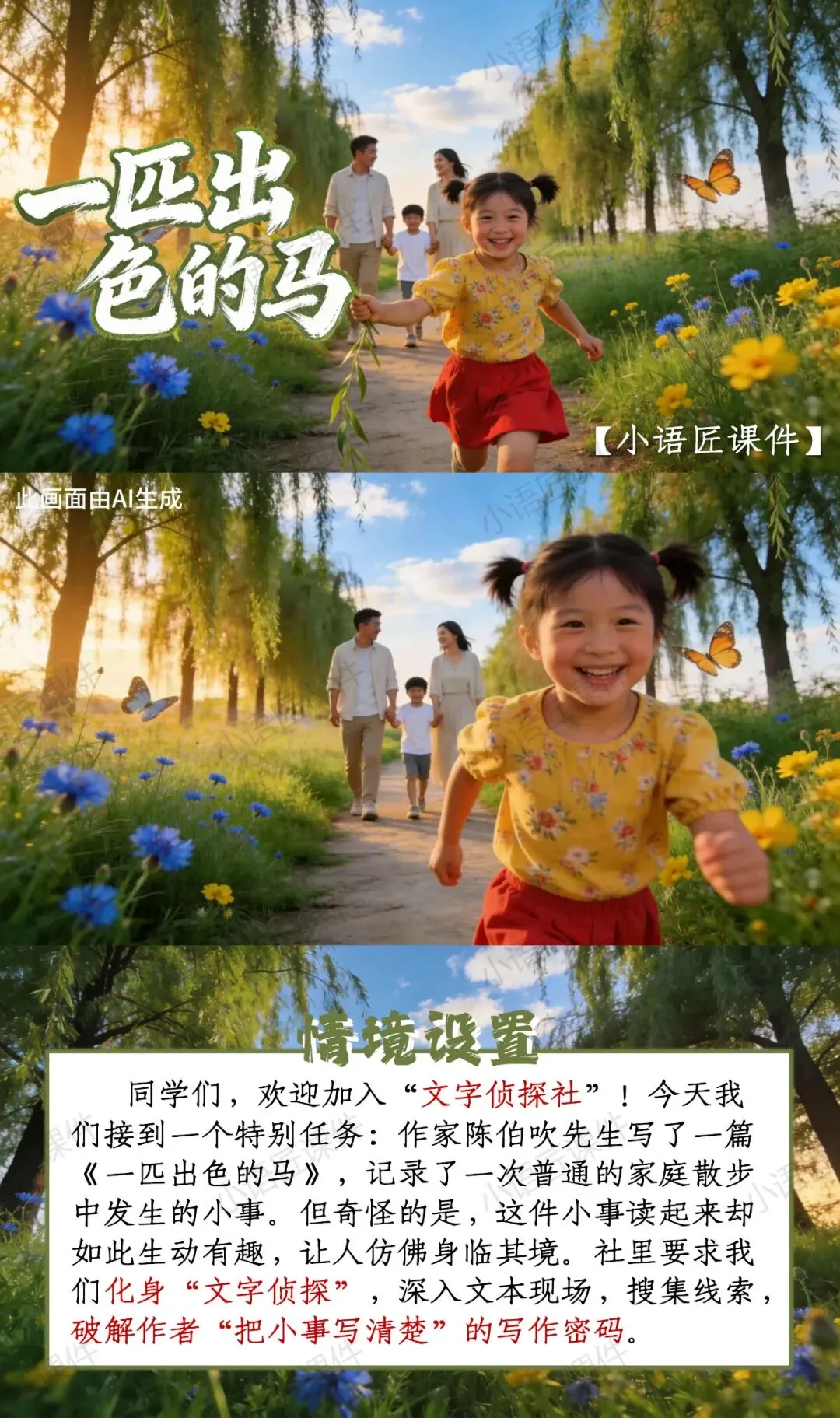 【二下课件】“文字侦探社,破解'小事大作'的写作密码”——《一匹出色的马》(视频++教学设计)