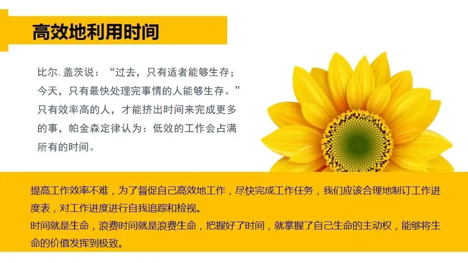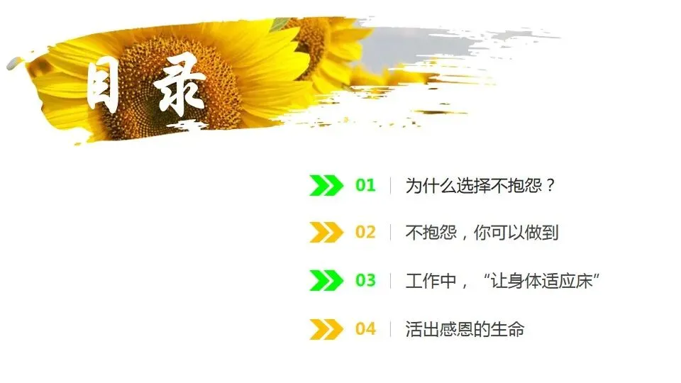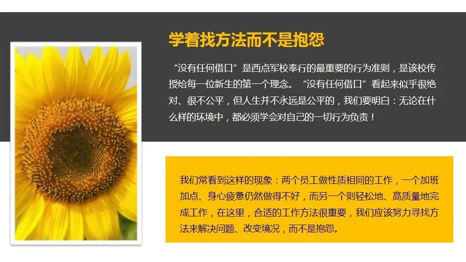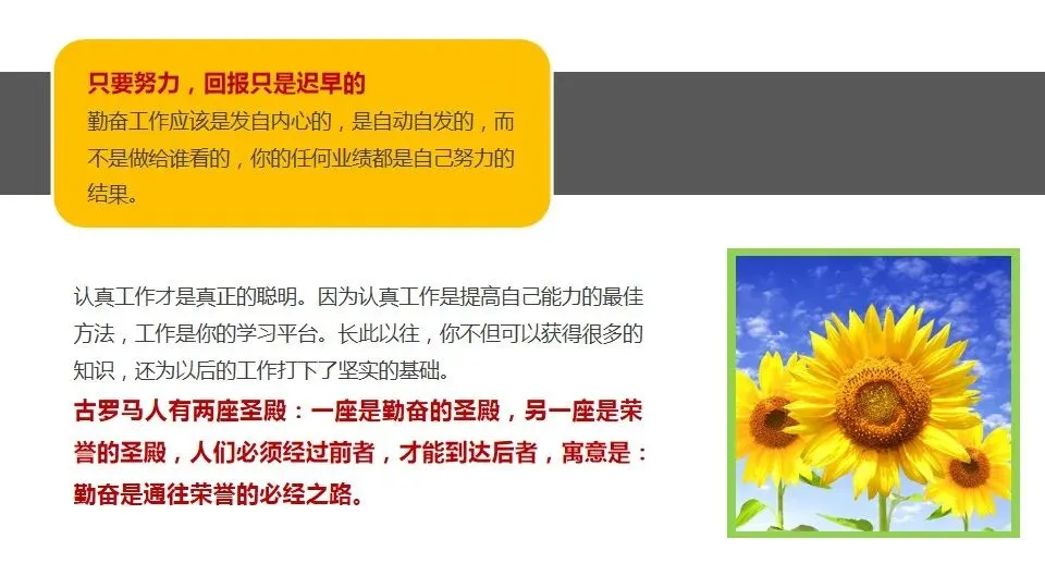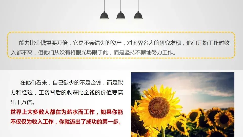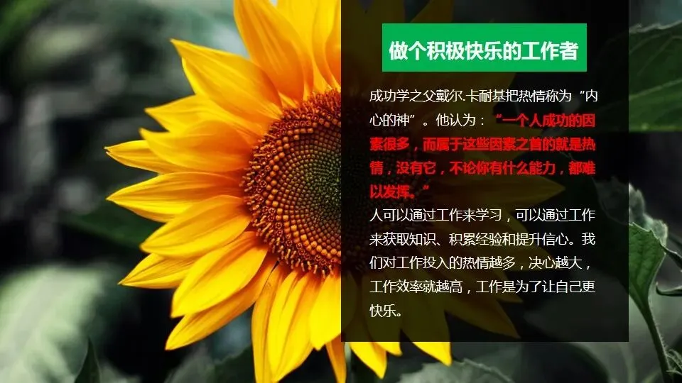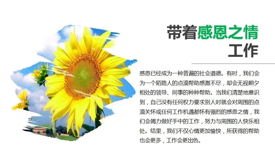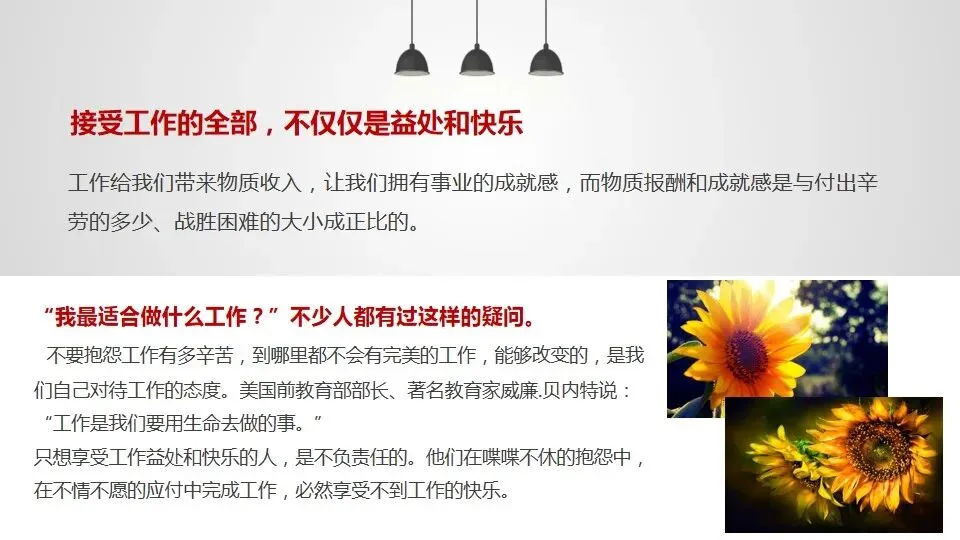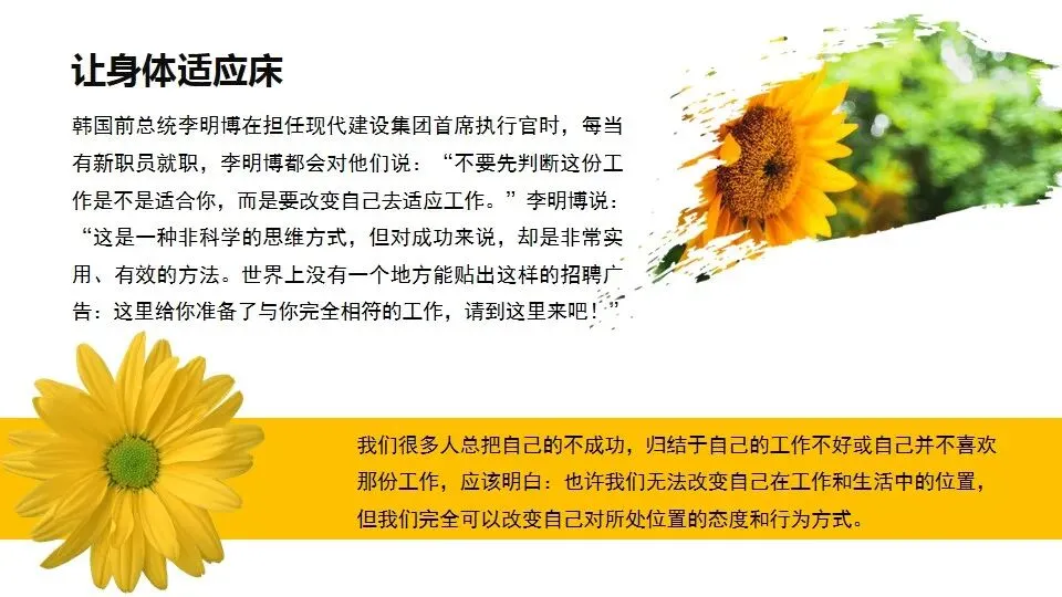 三.工作中,“让身体适应床”让身体适应床韩国前总统李明博在担任现代建设集团首席执行官时,每当有新职员就职,李明博都会对他们说:“不要先判断这份工作是不是适合你,而是要改变自己去适应工作。”李明博说:“这是一种非科学的思维方式,但对成功来说,却是非常实用、有效的方法。世界上没有一个地方能贴出这样的招聘广告:这里给你准备了与你完全相符的工作,请到这里来吧!”我们很多人总把自己的不成功,归结于自己的工作不好或自己并不喜欢那份工作,应该明白:也许我们无法改变自己在工作和生活中的位置,但我们完全可以改变自己对所处位置的态度和行为方式。不仅仅为收入工作不要过多考虑你的工资,你应该用更多的时间去接受新的知识,培养自己的能力,展现自己的才华,因为这些东西才是真正的无价之宝。能力比金钱重要万倍,它是不会遗失的资产,对商界名人的研究发现,他们开始工作时收入都不高,但他们从没有将眼光局限于此,而是坚持不懈地努力工作。在他们看来,自己缺少的不是金钱,而是能力和经验,工资背后的收获比金钱的价值要高出千万倍。世界上大多数人都在为薪水而工作,如果你能不仅仅为收入工作,你就迈出了成功的第一步。接受工作的全部,不仅仅是益处和快乐工作给我们带来物质收入,让我们拥有事业的成就感,而物质报酬和成就感是与付出辛劳的多少、战胜困难的大小成正比的。“我最适合做什么工作?”不少人都有过这样的疑问。不要抱怨工作有多辛苦,到哪里都不会有完美的工作,能够改变的,是我们自己对待工作的态度。美国前教育部部长、著名教育家威廉.贝内特说:“工作是我们要用生命去做的事。”只想享受工作益处和快乐的人,是不负责任的。他们在喋喋不休的抱怨中,在不情不愿的应付中完成工作,必然享受不到工作的快乐。学着找方法而不是抱怨“没有任何借口”是西点军校奉行的最重要的行为准则,是该校传授给每一位新生的第一个理念。“没有任何借口”看起来似乎很绝对、很不公平,但人生并不永远是公平的,我们要明白:无论在什么样的环境中,都必须学会对自己的一切行为负责!我们常看到这样的现象:两个员工做性质相同的工作,一个加班加点、身心疲惫仍然做得不好,而另一个则轻松地、高质量地完成工作,在这里,合适的工作方法很重要,我们应该努力寻找方法来解决问题、改变境况,而不是抱怨。只要努力,回报只是迟早的勤奋工作应该是发自内心的,是自动自发的,而不是做给谁看的,你的任何业绩都是自己努力的结果。认真工作才是真正的聪明。因为认真工作是提高自己能力的最佳方法,工作是你的学习平台。长此以往,你不但可以获得很多的知识,还为以后的工作打下了坚实的基础。古罗马人有两座圣殿:一座是勤奋的圣殿,另一座是荣誉的圣殿,人们必须经过前者,才能到达后者,寓意是:勤奋是通往荣誉的必经之路。高效地利用时间比尔.盖茨说:“过去,只有适者能够生存;今天,只有最快处理完事情的人能够生存。”只有效率高的人,才能挤出时间来完成更多的事,帕金森定律认为:低效的工作会占满所有的时间。提高工作效率不难,为了督促自己高效地工作,尽快完成工作任务,我们应该合理地制订工作进度表,对工作进度进行自我追踪和检视。时间就是生命,浪费时间就是浪费生命,把握好了时间,就掌握了自己生命的主动权,能够将生命的价值发挥到极致。做个积极快乐的工作者成功学之父戴尔.卡耐基把热情称为“内心的神”。他认为:“一个人成功的因素很多,而属于这些因素之首的就是热情,没有它,不论你有什么能力,都难以发挥。”人可以通过工作来学习,可以通过工作来获取知识、积累经验和提升信心。我们对工作投入的热情越多,决心越大,工作效率就越高,工作是为了让自己更快乐。四.活出感恩的生命带着感恩之情工作感恩已经成为一种普遍的社会道德。有时,我们会为一个陌路人的点滴帮助感激不尽,却会无视朝夕相处的领导、同事的种种帮助。当我们清楚地意识到,自己没有任何权力要求别人时就会对周围的点滴关怀或任何工作机遇都怀有强烈的感恩之情,我们会竭力做好手中的工作,努力与周围的人快乐相处。结果,我们不仅心情更加愉快,所获得的帮助也会更多,工作会更出色。人就是为了解决麻烦而生成功者之所以成功,并不是因为他们没遇到麻烦,而是他们没被麻烦吓倒,依靠自己的能力和智慧解决了麻烦。活出感恩的生命蒙牛老总牛根生就曾在中年时期遇到麻烦,因为理念不同,牛根生辞去伊利生产经营副总裁的职务。当他去呼和浩特人才市场寻找工作时,发现以自己40岁的年龄,在人才市场很难有竞争力,于是他想,自己找份工作都很难,不如一心一意地做自己的事业。经过几年的努力,他终于创办了蒙牛集团。机会往往隐藏在麻烦当中,只有不怕麻烦的人才能抓住机会,获得成功。快乐就在当下就在你身边在现实生活中,我们总是被各种各样的欲望包围,许多梦想,使我们恍恍惚惚,使我们不屑于生活在这一刻,其实,只有这一刻才是真实的,才是可以把握的。活得精彩不是你拥有多少财富和多高地位,而是活出好心情并把快乐传播给周围的人。打造不抱怨的快乐人生帮助他人的最好方法,就是过不抱怨的生活,成为不抱怨的榜样。学着去爱身边的人,做自己举手之