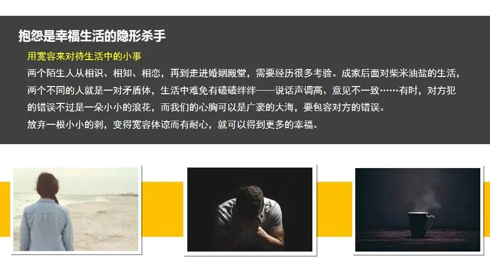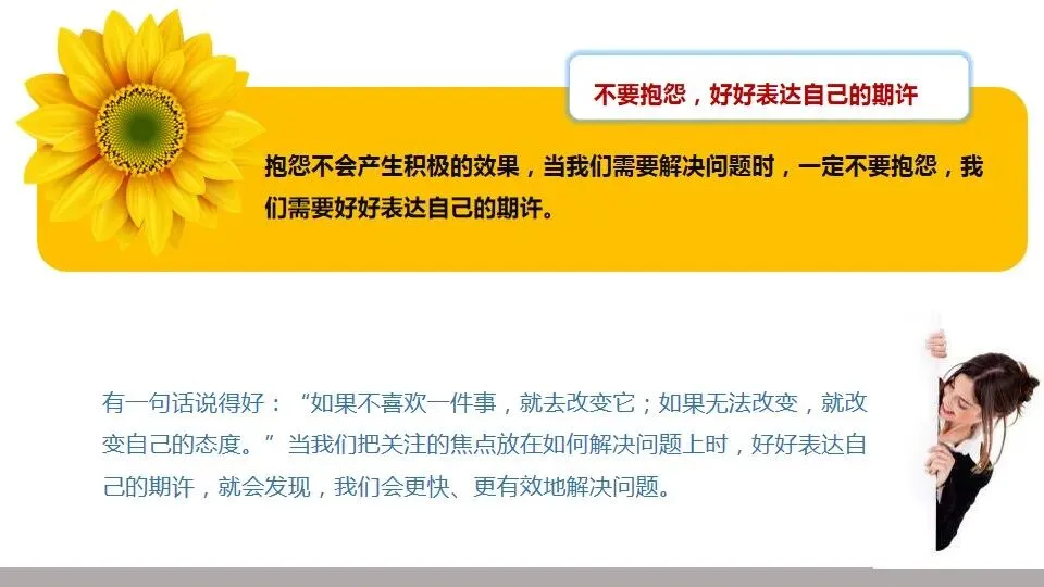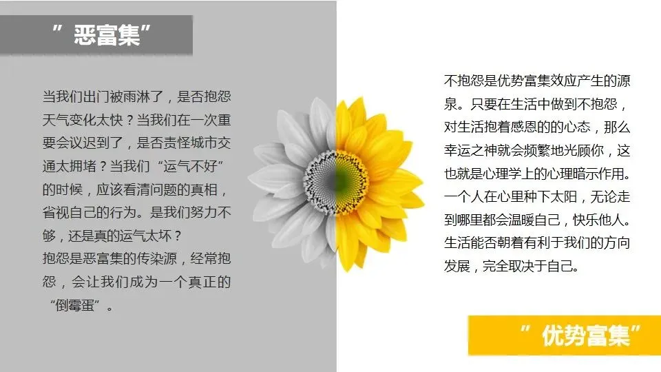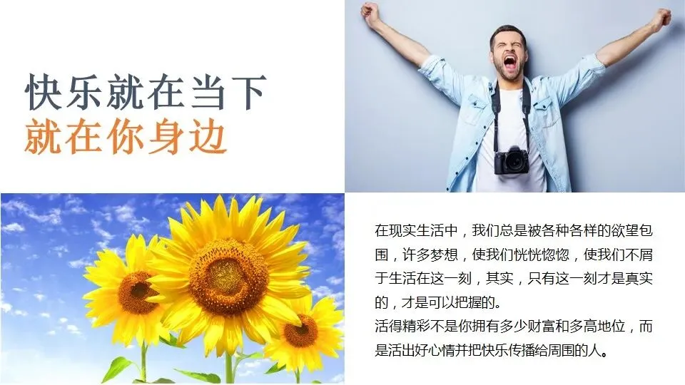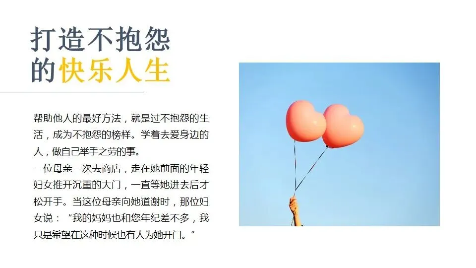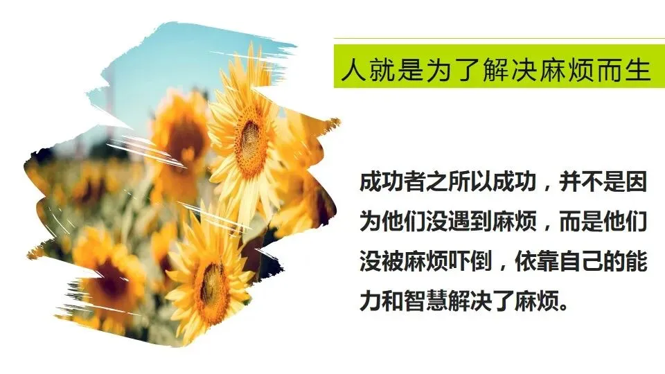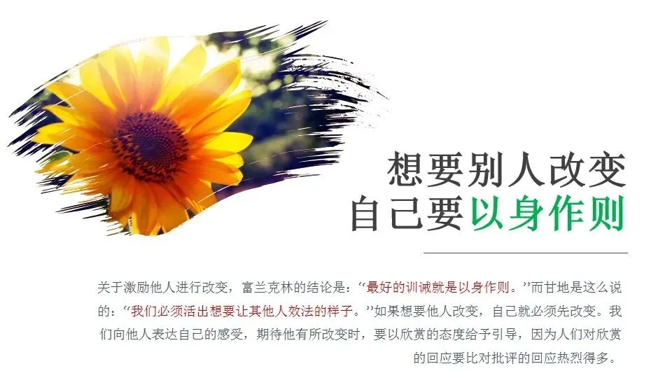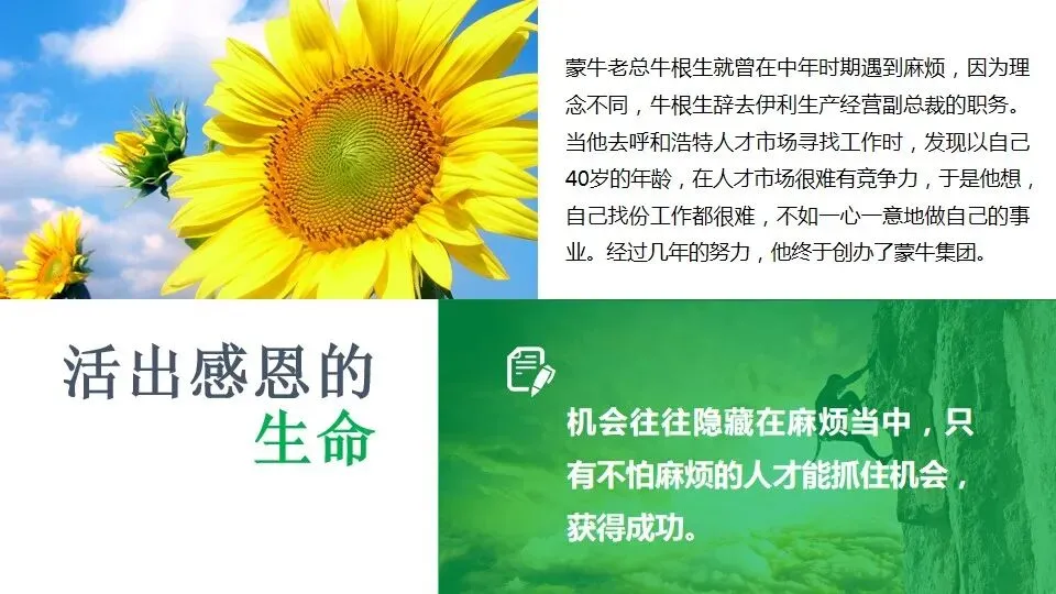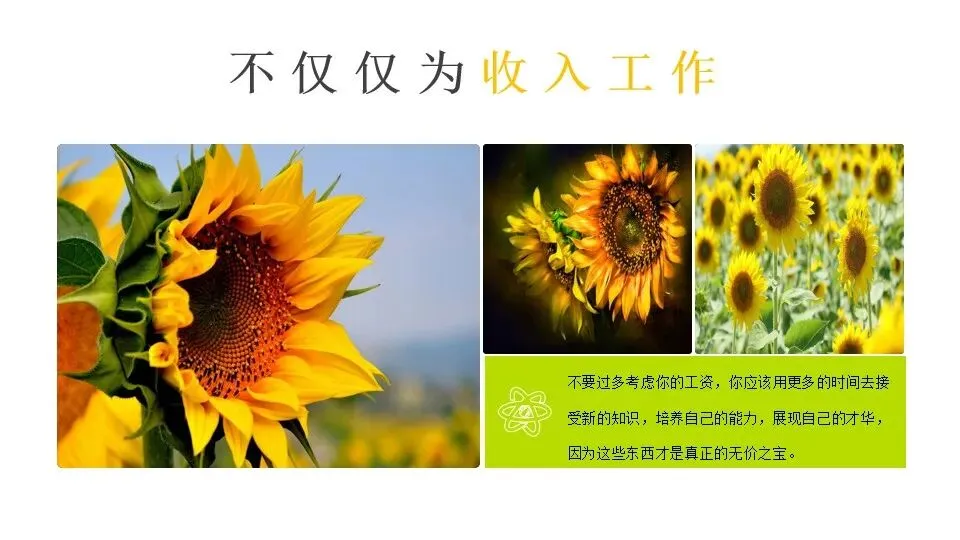 三.工作中,“让身体适应床”让身体适应床韩国前总统李明博在担任现代建设集团首席执行官时,每当有新职员就职,李明博都会对他们说:“不要先判断这份工作是不是适合你,而是要改变自己去适应工作。”李明博说:“这是一种非科学的思维方式,但对成功来说,却是非常实用、有效的方法。世界上没有一个地方能贴出这样的招聘广告:这里给你准备了与你完全相符的工作,请到这里来吧!”我们很多人总把自己的不成功,归结于自己的工作不好或自己并不喜欢那份工作,应该明白:也许我们无法改变自己在工作和生活中的位置,但我们完全可以改变自己对所处位置的态度和行为方式。不仅仅为收入工作不要过多考虑你的工资,你应该用更多的时间去接受新的知识,培养自己的能力,展现自己的才华,因为这些东西才是真正的无价之宝。能力比金钱重要万倍,它是不会遗失的资产,对商界名人的研究发现,他们开始工作时收入都不高,但他们从没有将眼光局限于此,而是坚持不懈地努力工作。在他们看来,自己缺少的不是金钱,而是能力和经验,工资背后的收获比金钱的价值要高出千万倍。世界上大多数人都在为薪水而工作,如果你能不仅仅为收入工作,你就迈出了成功的第一步。接受工作的全部,不仅仅是益处和快乐工作给我们带来物质收入,让我们拥有事业的成就感,而物质报酬和成就感是与付出辛劳的多少、战胜困难的大小成正比的。“我最适合做什么工作?”不少人都有过这样的疑问。不要抱怨工作有多辛苦,到哪里都不会有完美的工作,能够改变的,是我们自己对待工作的态度。美国前教育部部长、著名教育家威廉.贝内特说:“工作是我们要用生命去做的事。”只想享受工作益处和快乐的人,是不负责任的。他们在喋喋不休的抱怨中,在不情不愿的应付中完成工作,必然享受不到工作的快乐。学着找方法而不是抱怨“没有任何借口”是西点军校奉行的最重要的行为准则,是该校传授给每一位新生的第一个理念。“没有任何借口”看起来似乎很绝对、很不公平,但人生并不永远是公平的,我们要明白:无论在什么样的环境中,都必须学会对自己的一切行为负责!我们常看到这样的现象:两个员工做性质相同的工作,一个加班加点、身心疲惫仍然做得不好,而另一个则轻松地、高质量地完成工作,在这里,合适的工作方法很重要,我们应该努力寻找方法来解决问题、改变境况,而不是抱怨。只要努力,回报只是迟早的勤奋工作应该是发自内心的,是自动自发的,而不是做给谁看的,你的任何业绩都是自己努力的结果。认真工作才是真正的聪明。因为认真工作是提高自己能力的最佳方法,工作是你的学习平台。长此以往,你不但可以获得很多的知识,还为以后的工作打下了坚实的基础。古罗马人有两座圣殿:一座是勤奋的圣殿,另一座是荣誉的圣殿,人们必须经过前者,才能到达后者,寓意是:勤奋是通往荣誉的必经之路。高效地利用时间比尔.盖茨说:“过去,只有适者能够生存;今天,只有最快处理完事情的人能够生存。”只有效率高的人,才能挤出时间来完成更多的事,帕金森定律认为:低效的工作会占满所有的时间。提高工作效率不难,为了督促自己高效地工作,尽快完成工作任务,我们应该合理地制订工作进度表,对工作进度进行自我追踪和检视。时间就是生命,浪费时间就是浪费生命,把握好了时间,就掌握了自己生命的主动权,能够将生命的价值发挥到极致。做个积极快乐的工作者成功学之父戴尔.卡耐基把热情称为“内心的神”。他认为:“一个人成功的因素很多,而属于这些因素之首的就是热情,没有它,不论你有什么能力,都难以发挥。”人可以通过工作来学习,可以通过工作来获取知识、积累经验和提升信心。我们对工作投入的热情越多,决心越大,工作效率就越高,工作是为了让自己更快乐。四.活出感恩的生命带着感恩之情工作感恩已经成为一种普遍的社会道德。有时,我们会为一个陌路人的点滴帮助感激不尽,却会无视朝夕相处的领导、同事的种种帮助。当我们清楚地意识到,自己没有任何权力要求别人时就会对周围的点滴关怀或任何工作机遇都怀有强烈的感恩之情,我们会竭力做好手中的工作,努力与周围的人快乐相处。结果,我们不仅心情更加愉快,所获得的帮助也会更多,工作会更出色。人就是为了解决麻烦而生成功者之所以成功,并不是因为他们没遇到麻烦,而是他们没被麻烦吓倒,依靠自己的能力和智慧解决了麻烦。活出感恩的生命蒙牛老总牛根生就曾在中年时期遇到麻烦,因为理念不同,牛根生辞去伊利生产经营副总裁的职务。当他去呼和浩特人才市场寻找工作时,发现以自己40岁的年龄,在人才市场很难有竞争力,于是他想,自己找份工作都很难,不如一心一意地做自己的事业。经过几年的努力,他终于创办了蒙牛集团。机会往往隐藏在麻烦当中,只有不怕麻烦的人才能抓住机会,获得成功。快乐就在当下就在你身边在现实生活中,我们总是被各种各样的欲望包围,许多梦想,使我们恍恍惚惚,使我们不屑于生活在这一刻,其实,只有这一刻才是真实的,才是可以把握的。活得精彩不是你拥有多少财富和多高地位,而是活出好心情并把快乐传播给周围的人。打造不抱怨的快乐人生帮助他人的最好方法,就是过不抱怨的生活,成为不抱怨的榜样。学着去爱身边的人,做自己举手之