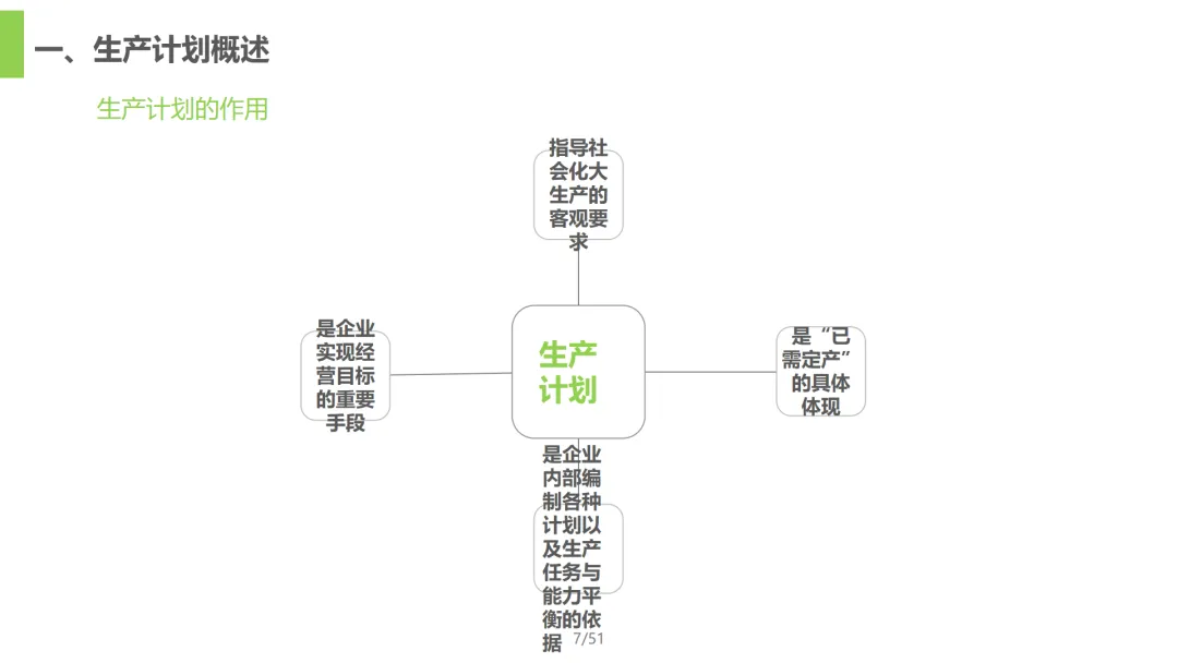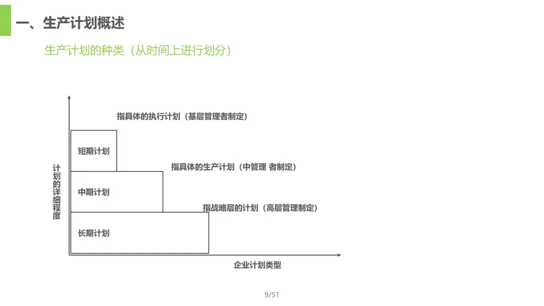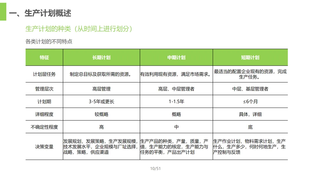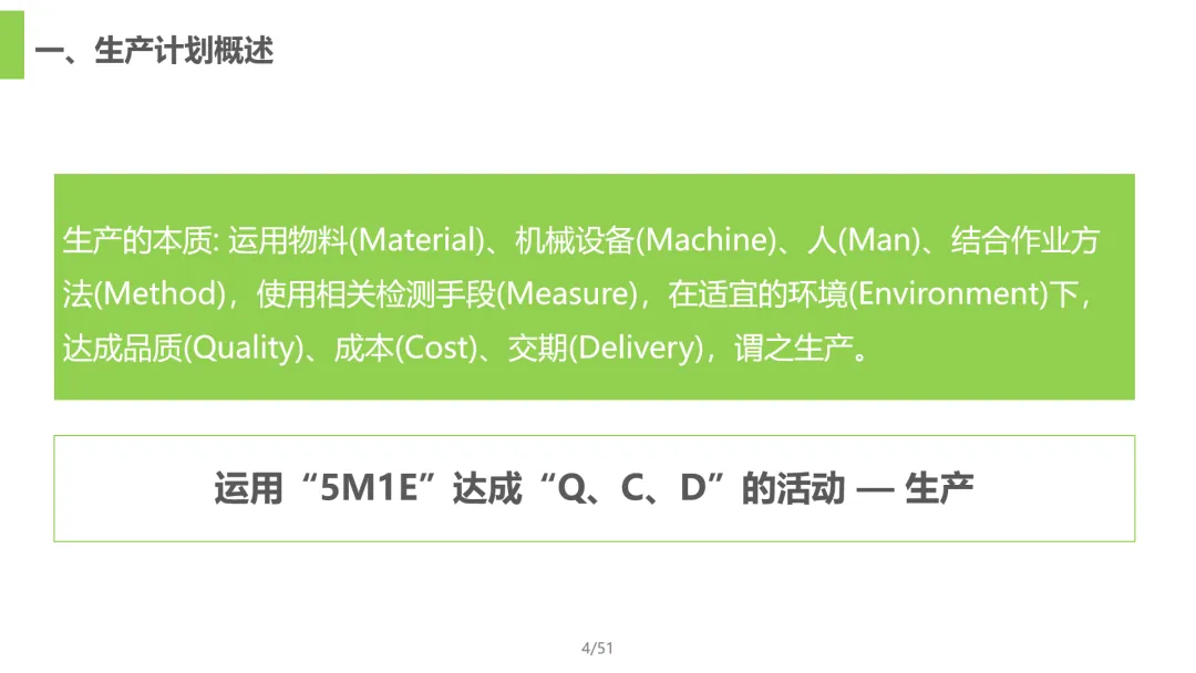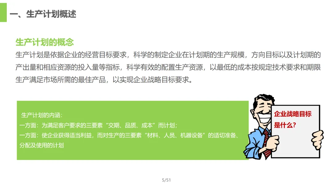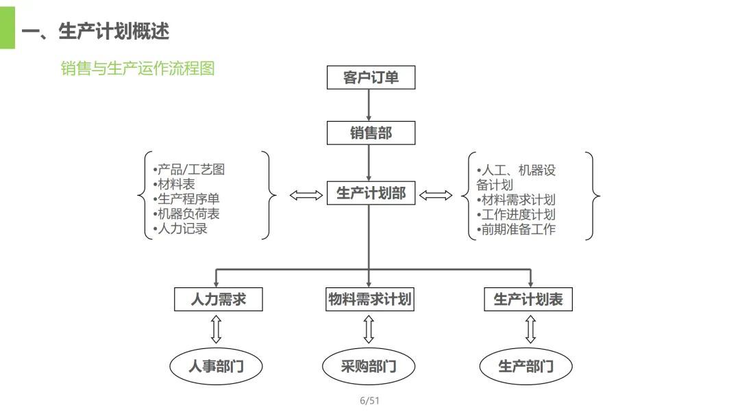 生产的本质(5M1E达成QCD)、计划的作用与种类(长/中/短期)、销售与生产运作流程