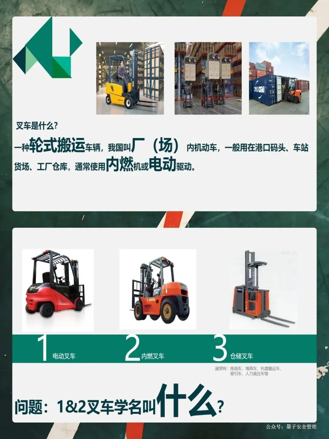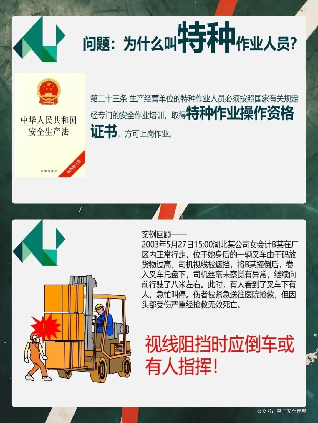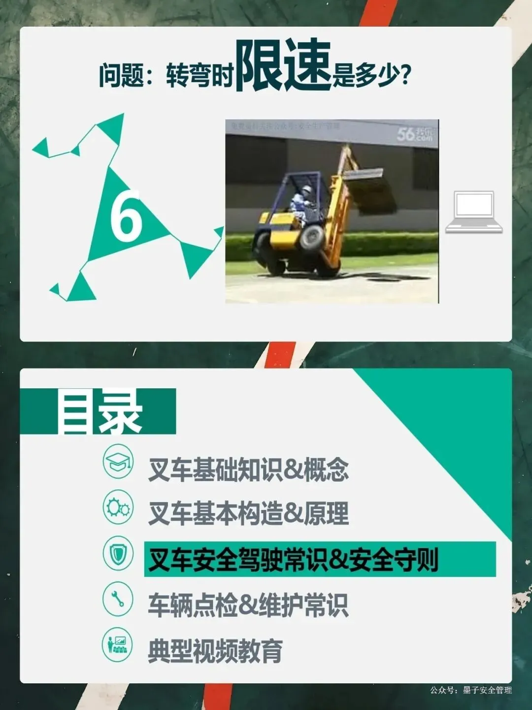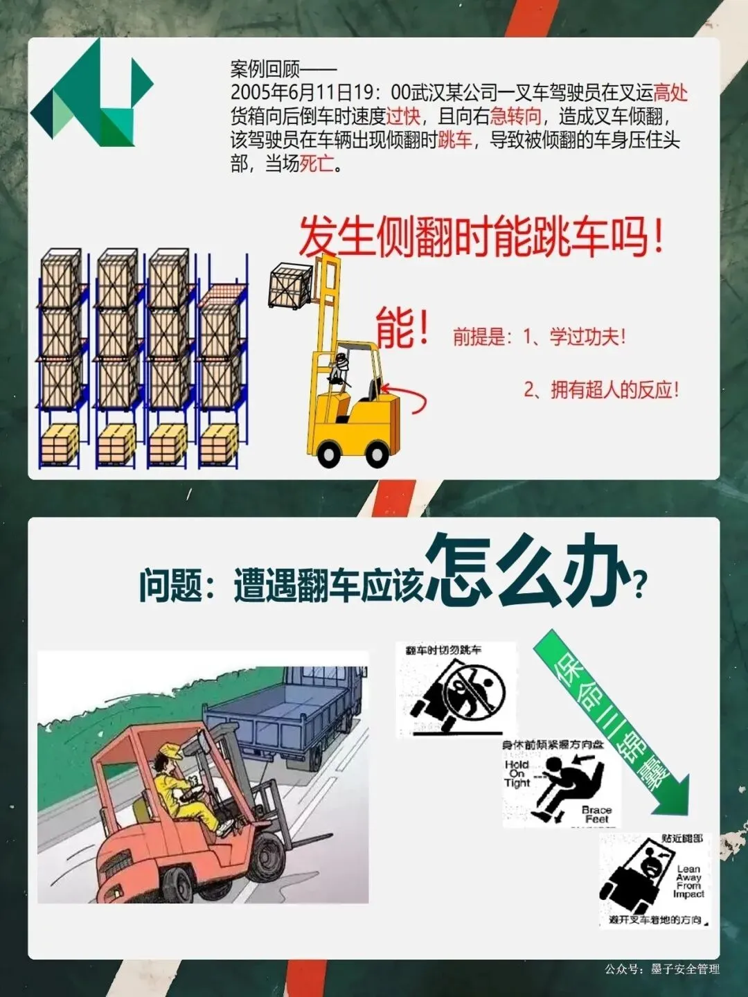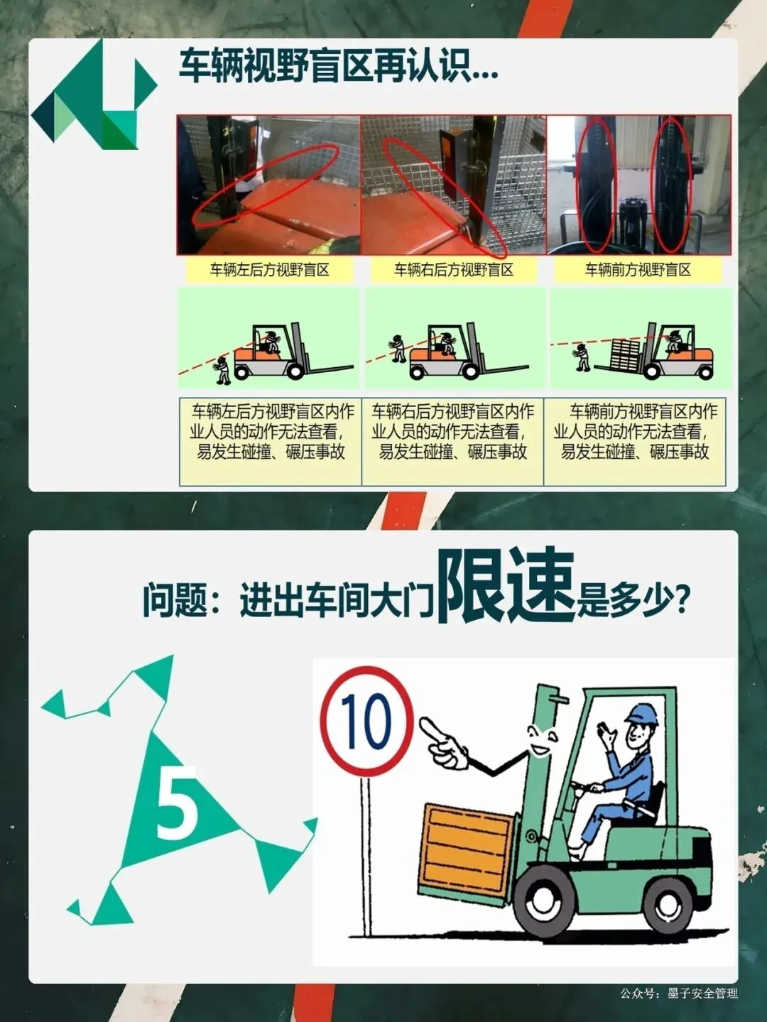大家开过车都知道,叉车的视野盲区特别大。特别是当你叉的货物太高,挡住了前面的视线时,千万不能往前开,必须倒车行驶。PPT里那个惨痛的案例,就是因为货物太高挡住了视线,司机没看见行人,酿成了大祸。这就要求我们,起步要鸣号,转弯要减速,看到行人要礼让。还有,大家一定要养成看后视镜的习惯。现在的车都装了倒车蜂鸣器,这就是在提醒周围的工友:“我来了,注意躲!”咱们开车的时候,不仅要管好手里的方向盘,还要时刻盯着车外的人。“宁停三分,不抢一秒”,这不仅是对自己负责,也是对身边同事的负责。