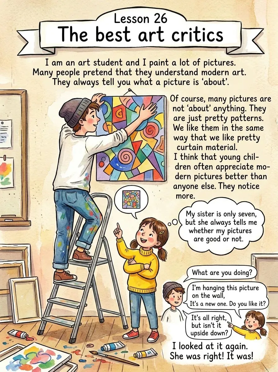 1. 相关文化背景知识-现代艺术 (Modern Art) 的挑战: 现代艺术,特别是抽象艺术,主动放弃了描绘 recognizable reality(可识别的现实)。这迫使观众从寻找“故事”转向感受颜色、形状、线条、质地和构图本身。本课作者指出了这一点,并建议我们用欣赏装饰品般的直接感官愉悦来接近这类艺术。-艺术评论 (Art Criticism) 的多元性: 艺术评论并非权威的独白。它可以是专业的学术论文,可以是报纸上的专栏,也可以是朋友间的一句“我喜欢这个颜色”。妹妹的评论属于最后一种——基于直接观察的个人反应。-“初学者心态” (Beginner's Mind): 这是一个源自禅宗的概念,指面对任何事情都保持像初学者一样开放、好奇、不带先入为主观念的心态。本课中孩子的视角正是“初学者心态”的体现。2. 引导性思考- 作者看重孩子视角的诚实和对细节的关注。在你的生活中,能否想到一个“新手”或领域外的人给你带来惊人 helpful 建议的情况?是什么?- 故事表明 overthinking(想太多)会让我们对简单的真相视而不见。你是否同意,在现代信息时代,我们更容易 overthinking 而不是相信简单的观察?为什么?- 如果艺术是关于个人体验和感知,那么只要观者觉得悦目,一幅画是否挂反了还重要吗?“挂反了”的版本能否被视为对作品一种新的、有效的诠释?