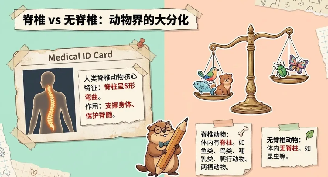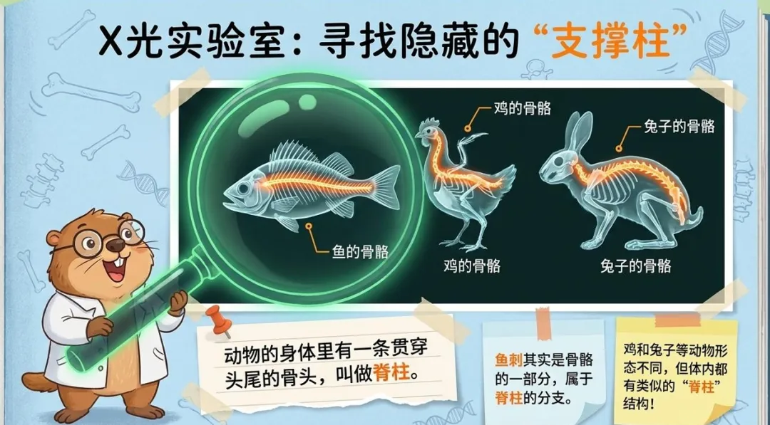 在核心知识点讲解上,先通过 “脊柱” 这一关键特征将动物分为脊椎与无脊椎动物,搭建动物分类的核心框架,再从食性、繁殖、运动等次要特征展开细分,符合 “从主到次” 的科学分类逻辑;对每个知识点的解读都摒弃专业术语的堆砌,如用 “贯穿头尾的骨头” 解释脊柱,用 “鱼刺是骨骼的一部分” 帮助学生理解鱼类的脊椎特征,同时搭配鸡、兔子、鱼的骨骼图片,通过直观具象的视觉素材降低理解难度。