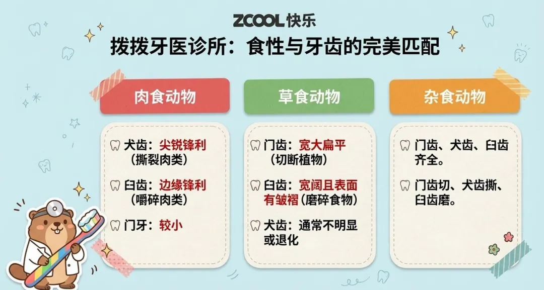 在食性、牙齿、繁殖方式等知识点的关联上,PPT 注重知识的关联性讲解,如将食性与牙齿结构匹配,让学生理解 “结构与功能相适应” 的科学核心概念,为后续科学学习奠定思维基础。