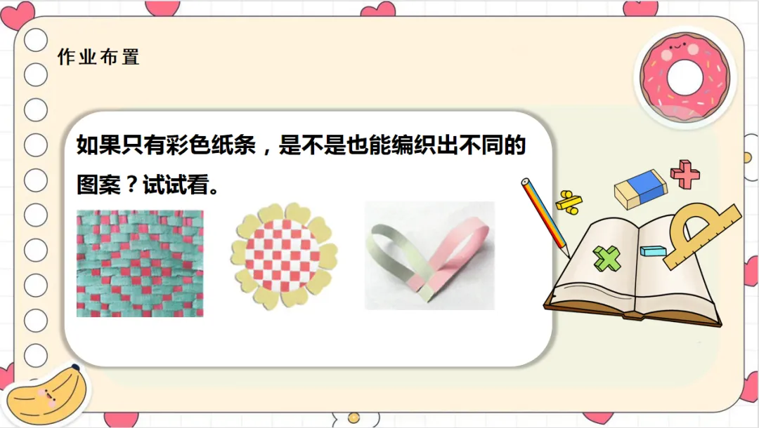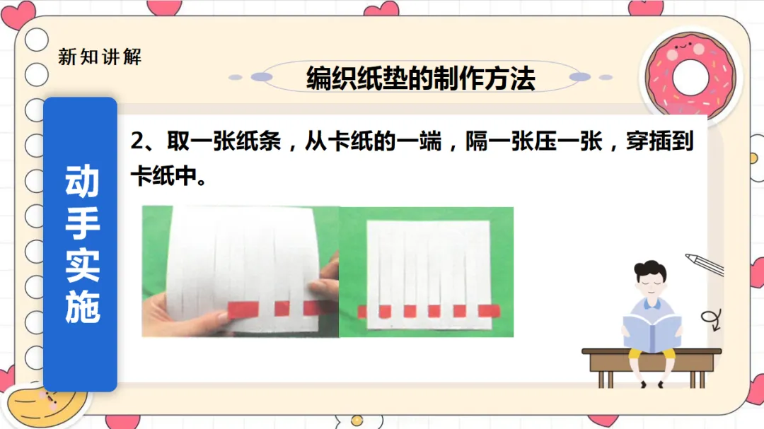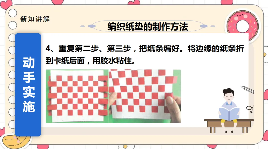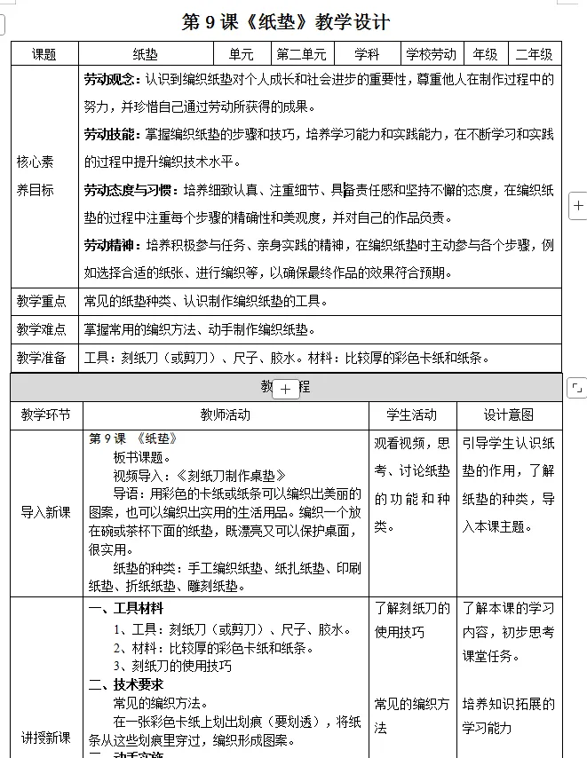 劳动精神:培养积极参与任务、亲身实践的精神,在编织纸垫时主动参与各个步骤,例如选择合适的纸张、进行编织等,以确保最终作品的效果符合预期。