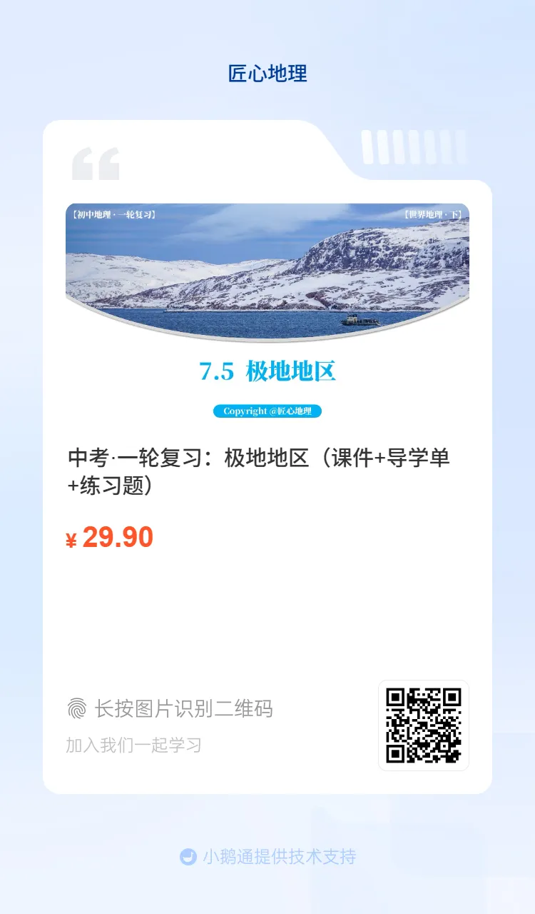 方式①:描下方二维码,获取新教材中考地理·一轮复习资料,含课件+导学单+练习题+送七八年级知识填图。(之前买过成套课件者,系统匹配优惠券,立减50)