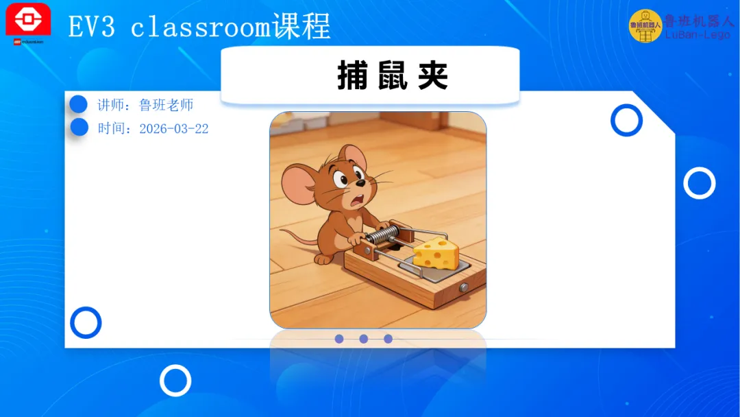 大家好,我是鲁班老师。本篇文章向大家介绍的作品是《EV3捕鼠夹》。全部作品目录点击文末【阅读原文】查看,或者在公众号聊天窗口发送关键字目录,会弹出所有作品目录链接。 | |