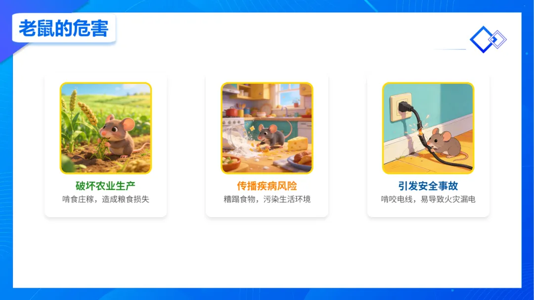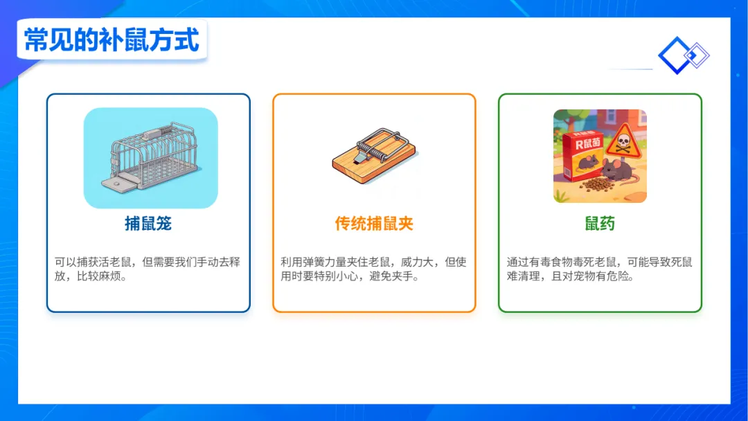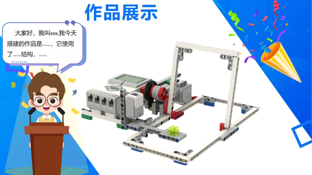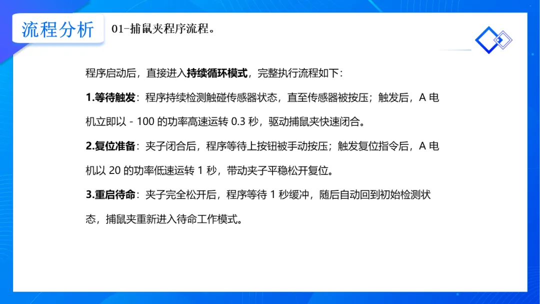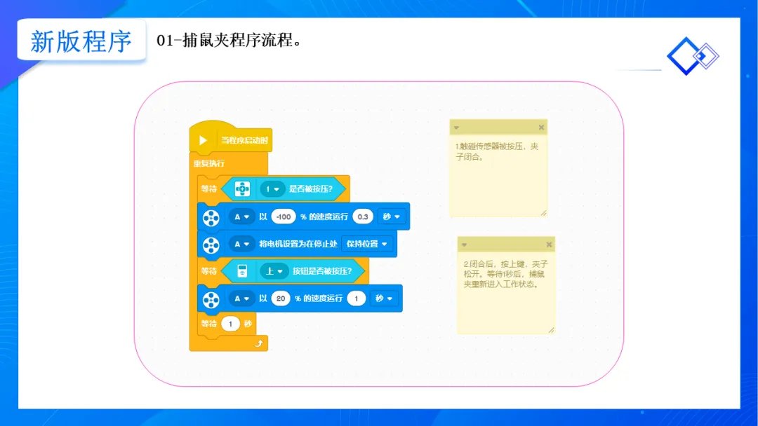 ①了解老鼠对农业生产和日常生活的危害,认识常见捕鼠方式的优缺点,理解EV3智能捕鼠夹中触碰传感器与齿轮加速机构的工作原理。②掌握触碰传感器作为触发装置的程序编写方法,搭建大齿轮带小齿轮的加速传动结构,掌握 EV3 捕鼠夹的核心工作原理。③培养利用传感器与机械结构解决实际问题的工程思维,强化安全意识与动手实践能力,激发用科技手段优化生活的创新意识。课件包含详细编程讲解,提供新版与旧版程序源文件,这里只展示1页。课程总结,这部分内容主要是方便老师做课后反馈,发家长群使用,老师们请根据自己的需要做适当更改。尊敬的家长: