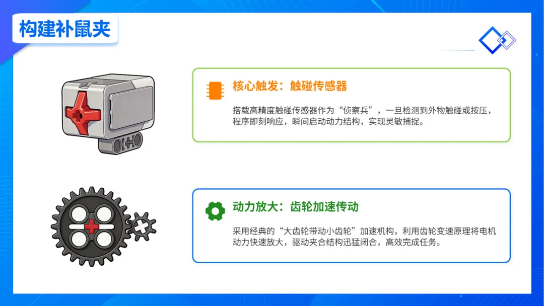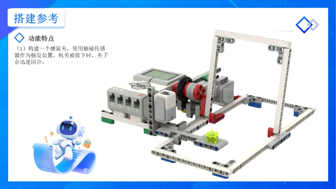 课堂上,孩子们先了解了老鼠啃食庄稼、啃咬电线的危害,以及捕鼠笼、传统捕鼠夹、鼠药的优缺点。随后动手搭建 EV3 捕鼠夹,掌握触碰传感器的触发原理和 “大齿轮带小齿轮” 的加速传动知识,还学习了捕鼠夹的完整程序流程,实现触发闭合、手动复位、循环待命的功能。