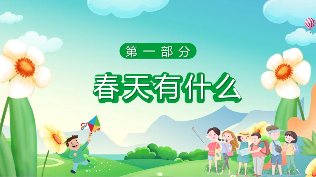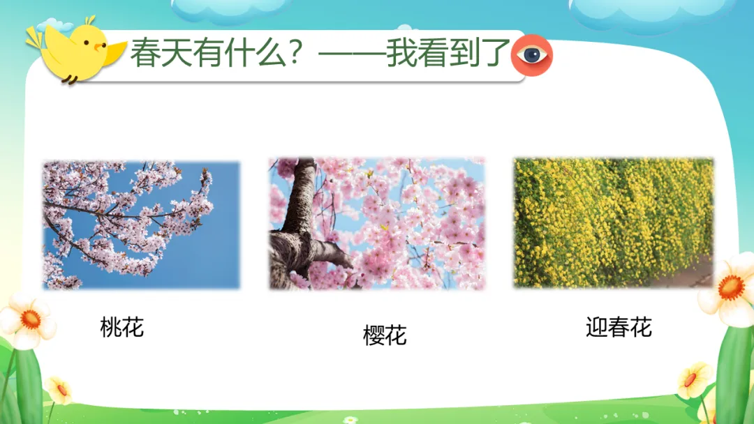 1.教师:首先春游是指在春天的时候出游,那么小朋友们知道春天有什么吗?