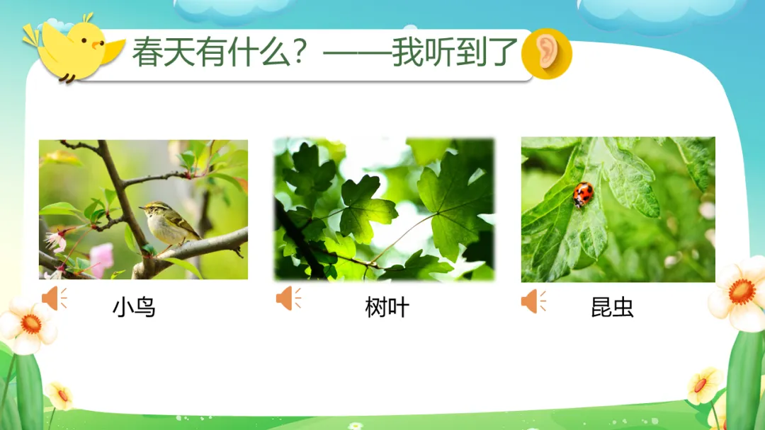 幼儿回答:小鸟的叫声、树叶被风吹动的沙沙声、小虫子唧唧的叫声。