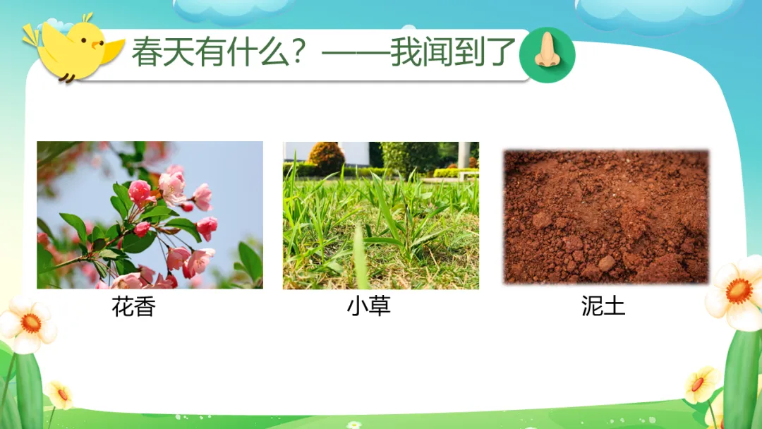 教师:空气中弥漫着,花朵的芬芳、小草的新鲜、泥土的清新。春天还有各种各样的味道,小朋友出去到处闻一闻就能发现。
