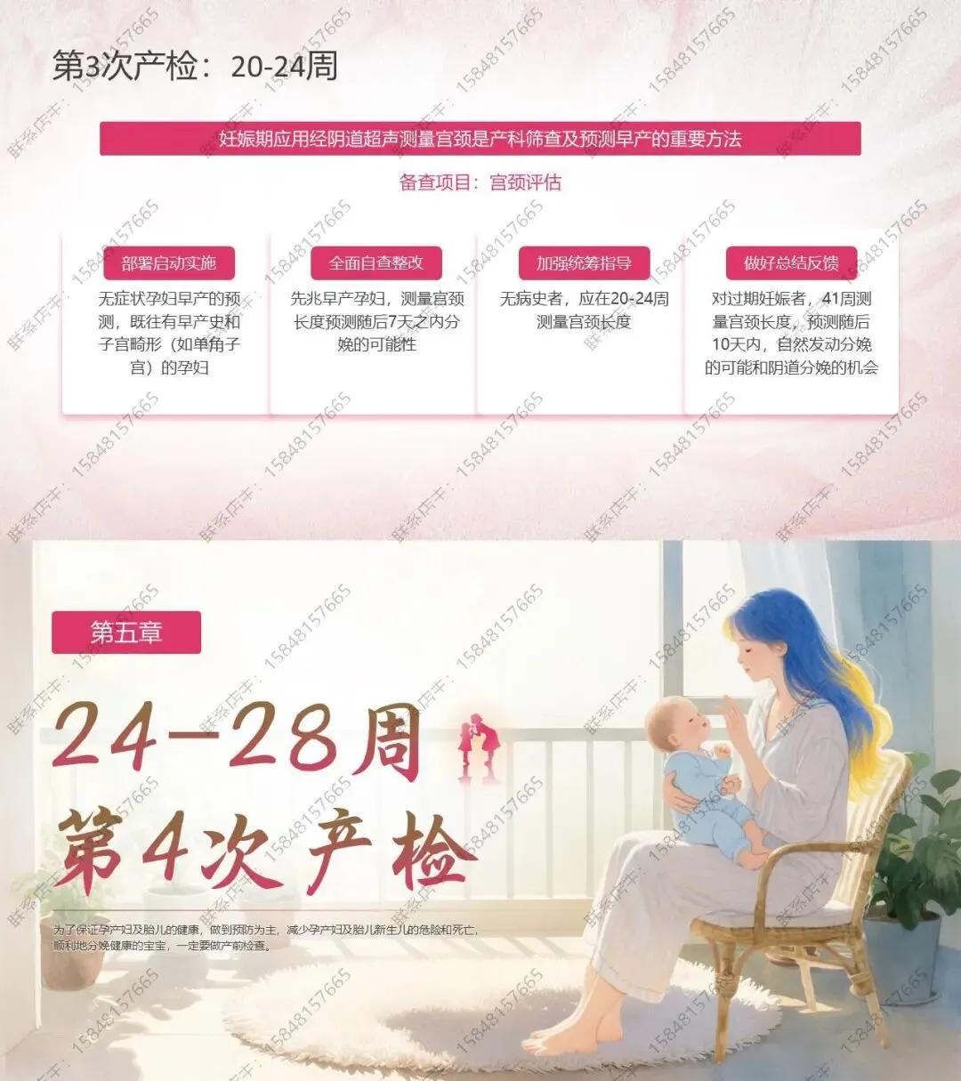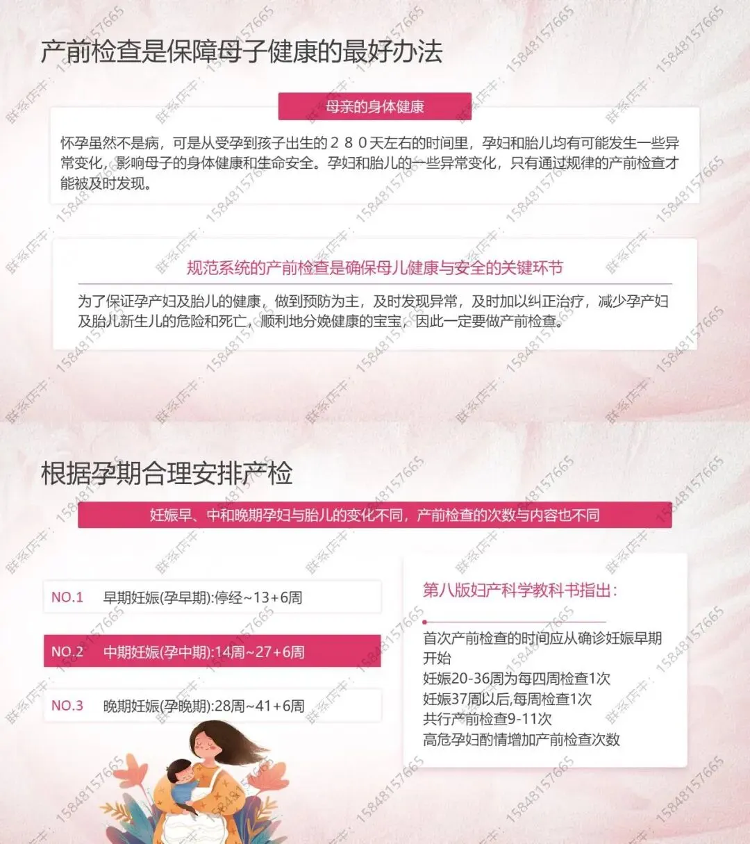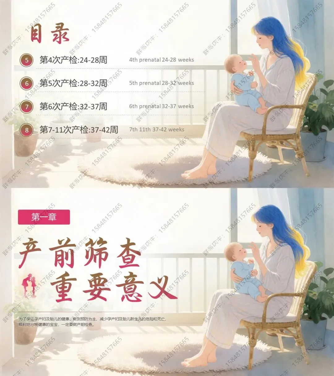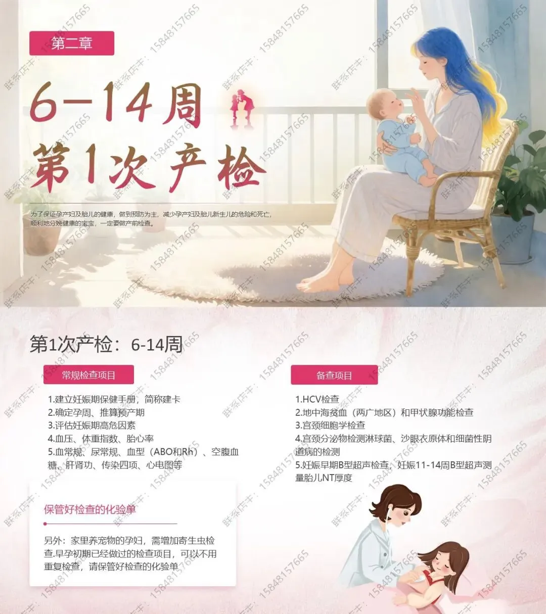 产前检查主要内容培训课件PPT/图文可自由编辑,共27页PPT+4172字讲义 产前筛查重要意义/第1次产检:6-14周/第2次产检:14-20周/第3次产检:20-24周 产前检查、孕期保健、产检项目、母婴健康、唐氏筛查、胎儿超声、妊娠期糖尿病筛查、孕期护理 添加店主获取:15848157665