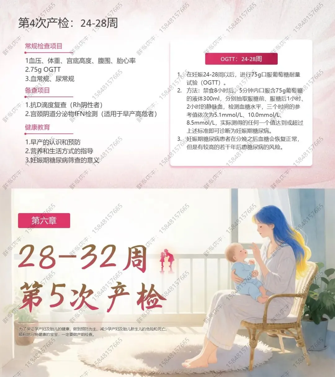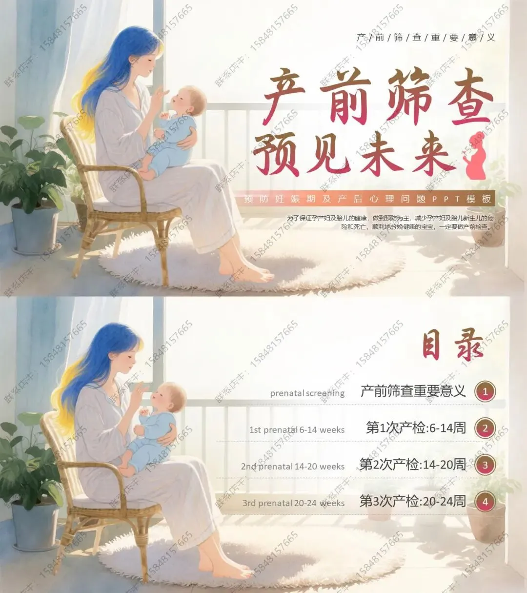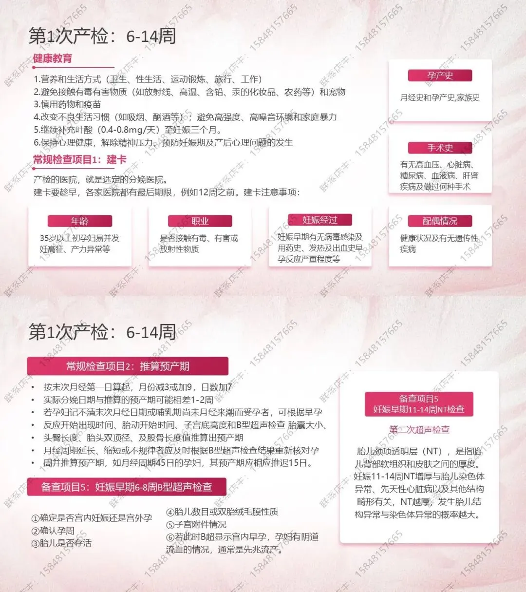 产前检查主要内容培训课件PPT/图文可自由编辑,共27页PPT+4172字讲义 产前筛查重要意义/第1次产检:6-14周/第2次产检:14-20周/第3次产检:20-24周 产前检查、孕期保健、产检项目、母婴健康、唐氏筛查、胎儿超声、妊娠期糖尿病筛查、孕期护理 添加店主获取:15848157665