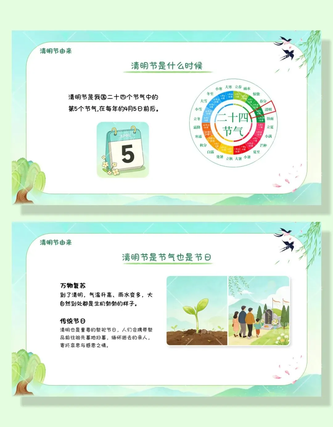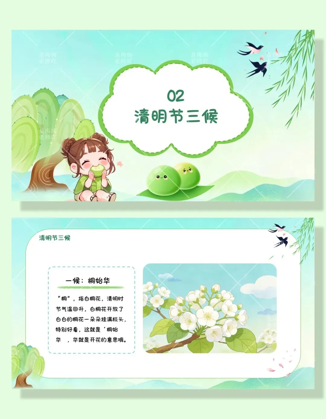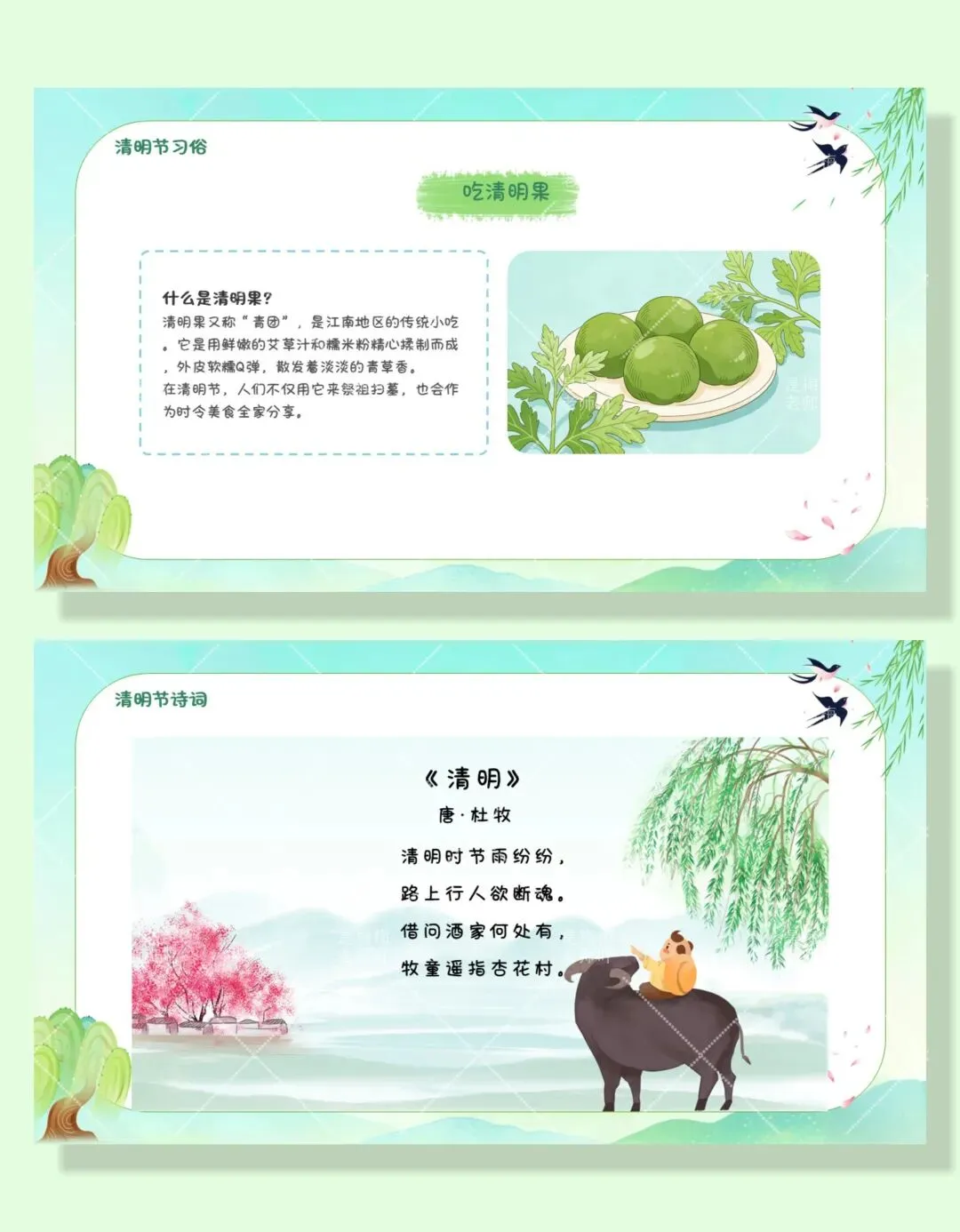 ◦认知目标:知道清明节是 4 月 5 日,是春天的传统节气和节日;了解清明三候的自然现象,认识清明节扫墓、踏青、吃青团等主要习俗;知晓青团的外形、颜色、制作原料及寓意。