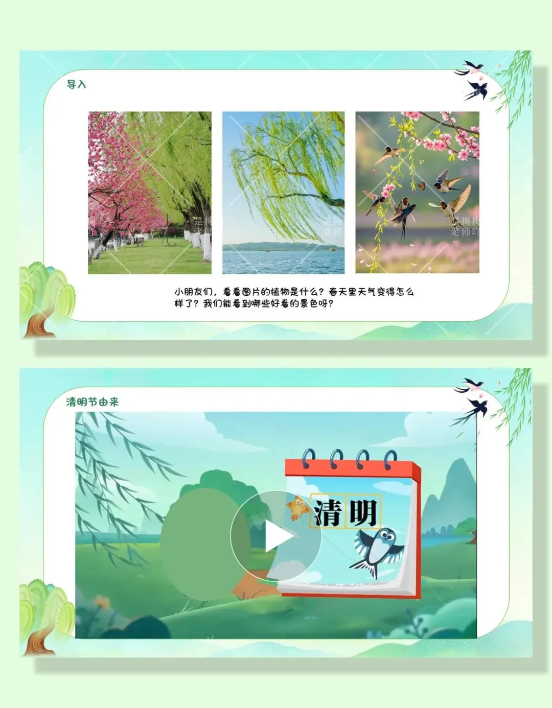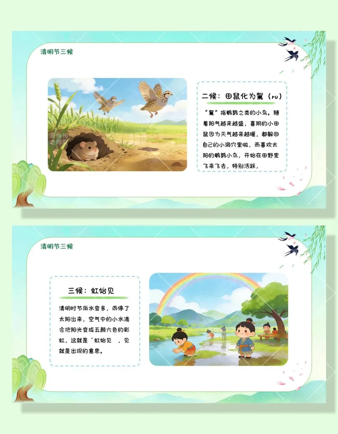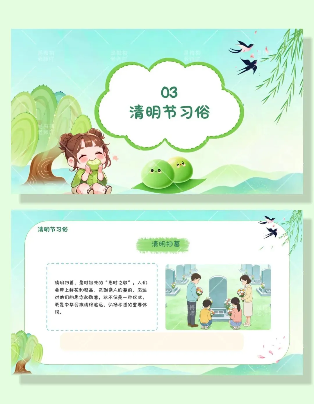 ◦认知目标:知道清明节是 4 月 5 日,是春天的传统节气和节日;了解清明三候的自然现象,认识清明节扫墓、踏青、吃青团等主要习俗;知晓青团的外形、颜色、制作原料及寓意。