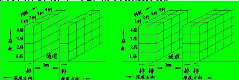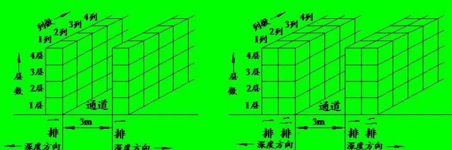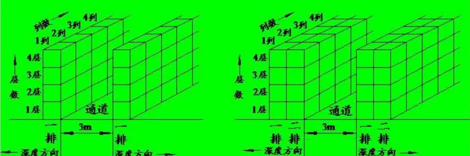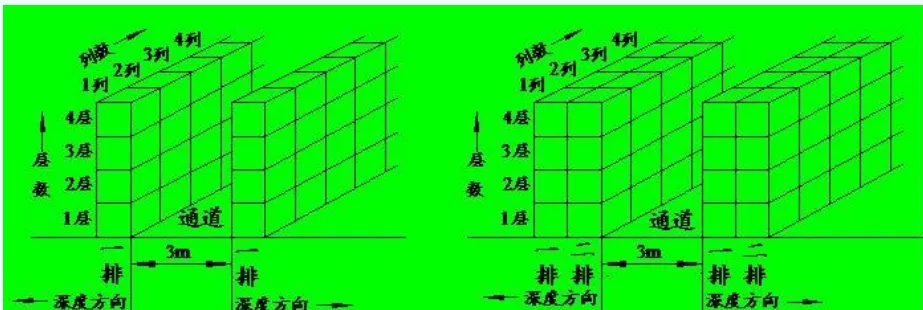 分类堆码时计算面积要考虑蜂窝损失。以图所示的分类堆码为例,图a为一个通道各有一排货物,每排货物有若干列,而每一列堆码四层。