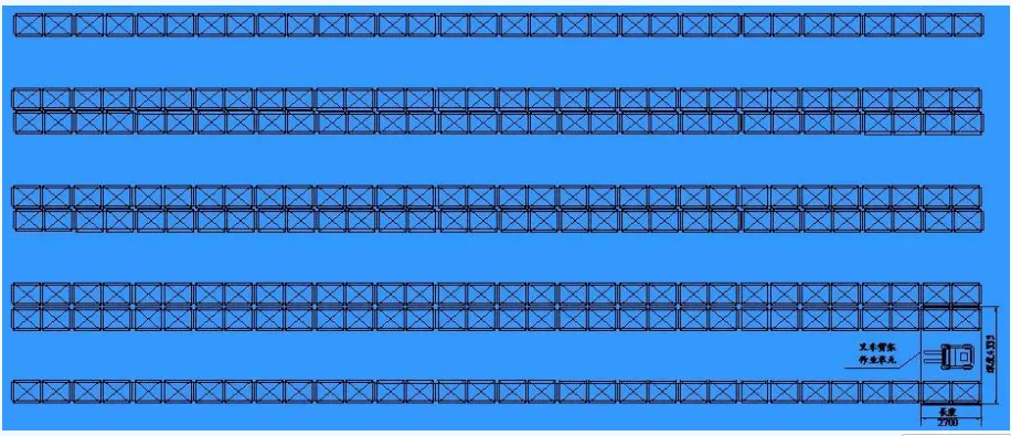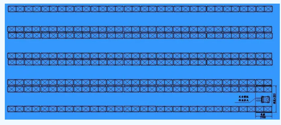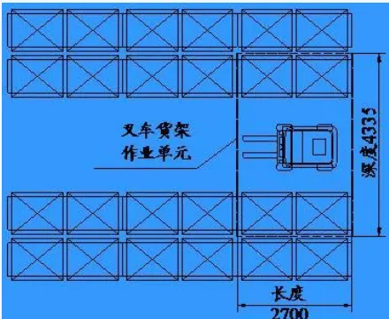 ■由于叉车两面作业,故可以确定叉车货架作业单元,见图。该单元共有16个托盘,长度为2.75m,直角堆垛最小通道宽