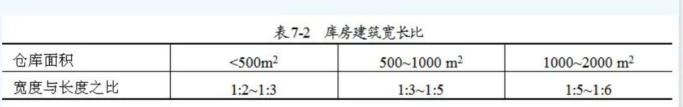 由上述直接计算法得出存储的有效面积后,加上必要的辅助面积,就可得仓库总面积,以此可作库房设计。库房的长度与宽度(跨度)与库房面积有关,在确定的面积下,长宽可以有无数种组合,但设计要按优先比例选取,一般如下表所示。