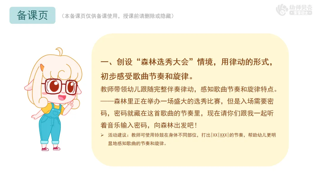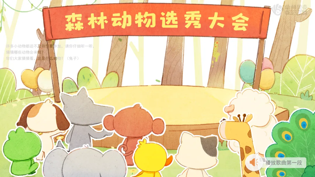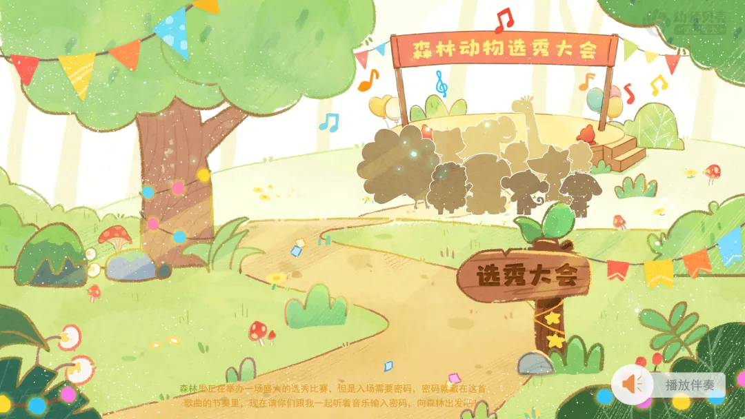 ——森林里正在举办一场盛大的选秀比赛,但是入场需要密码,密码就藏在这首歌曲的节奏里,现在请你们跟我一起听着音乐输入密码,向森林出发吧!