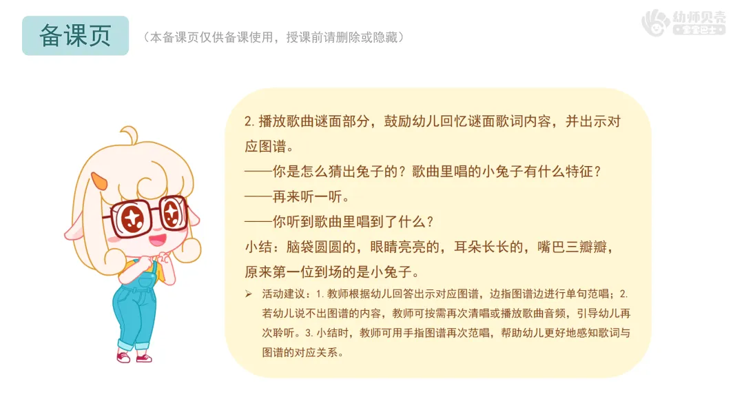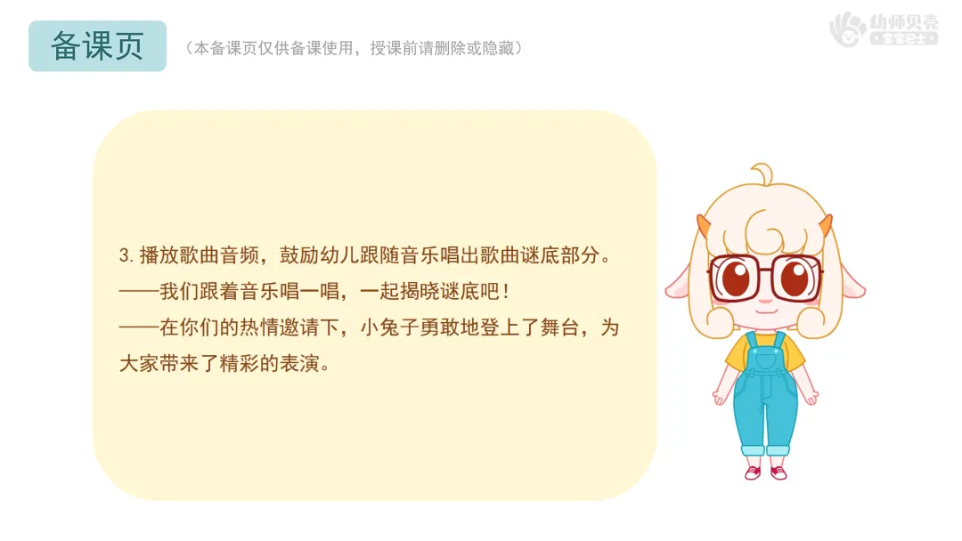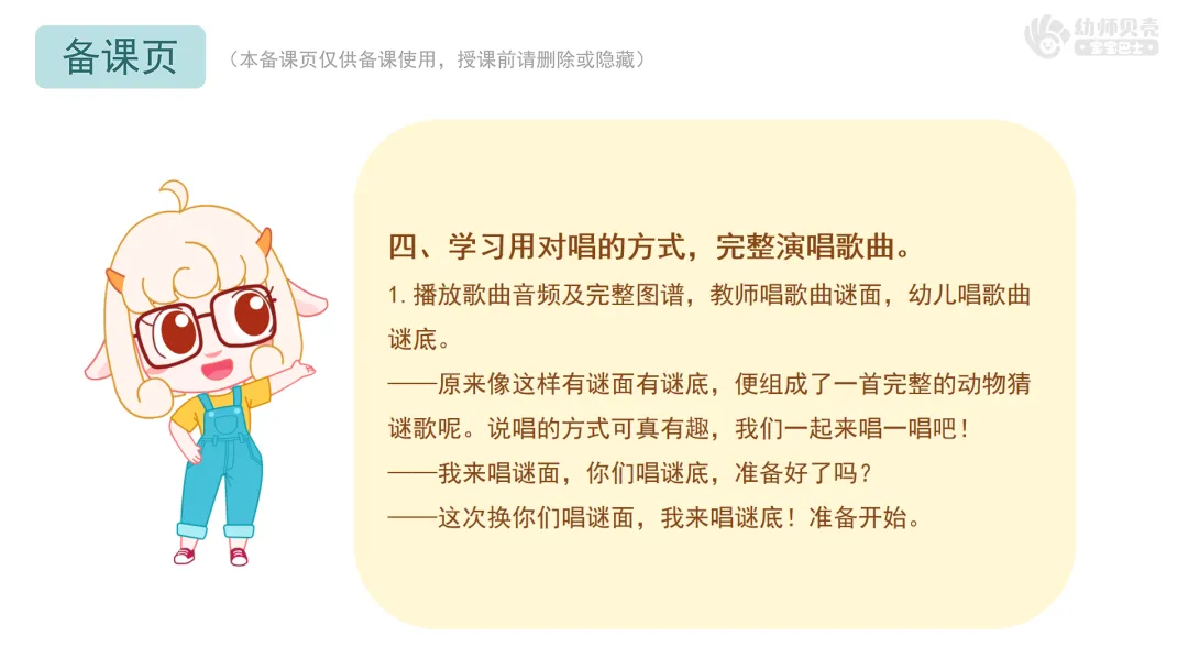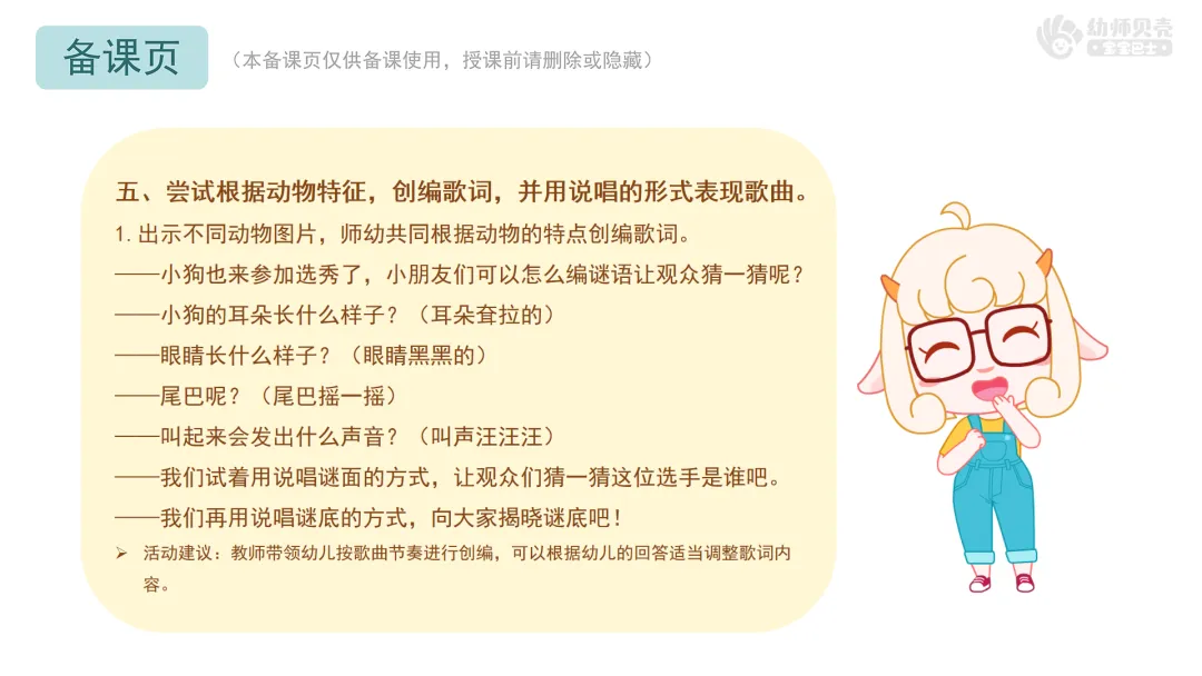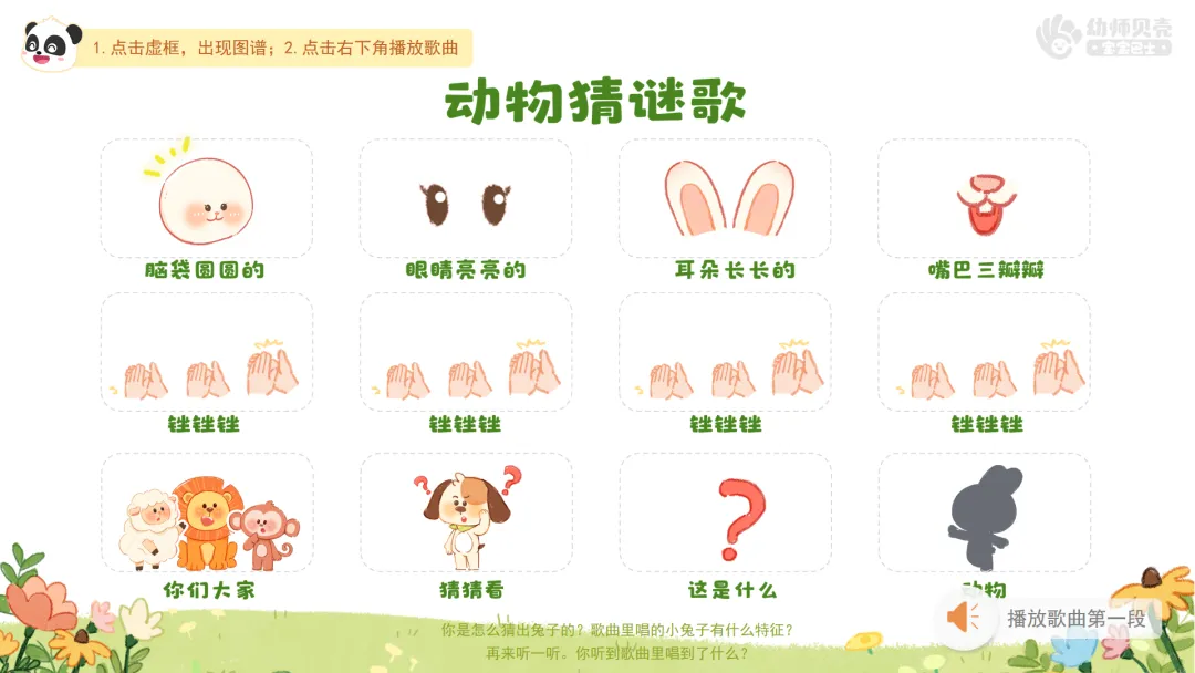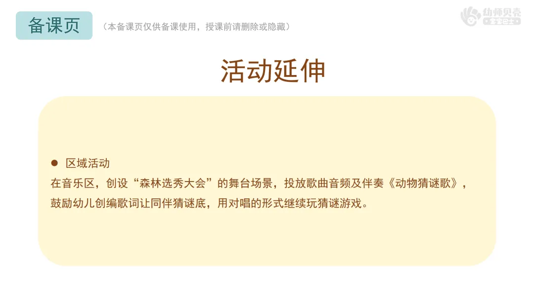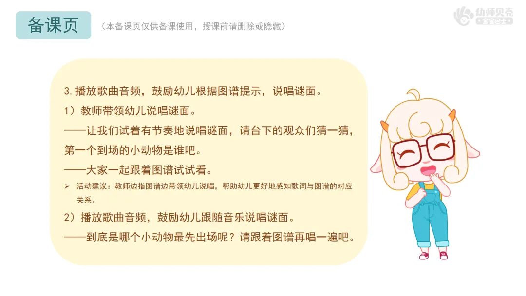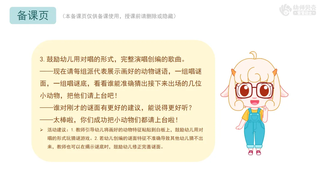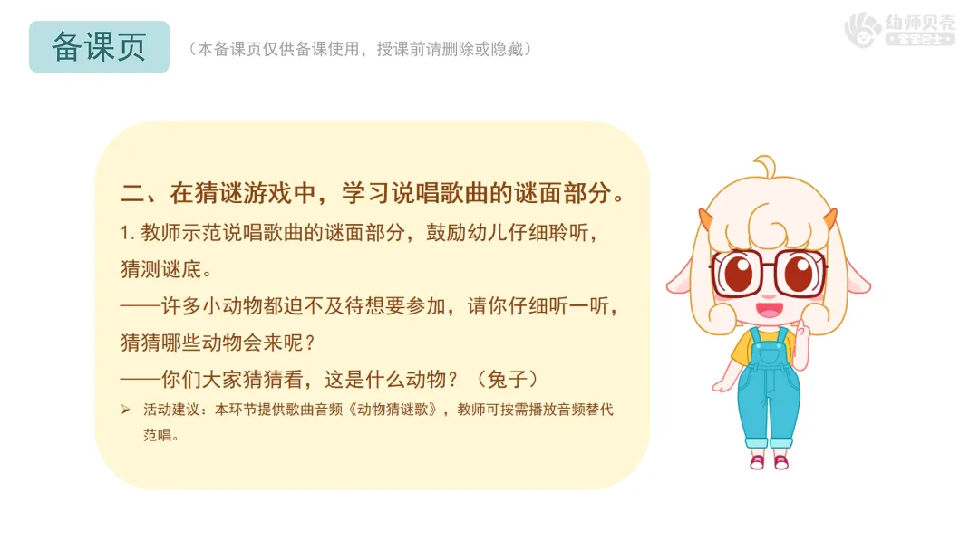 Ø活动建议:本环节提供歌曲音频《动物猜谜歌》,教师可按需播放音频替代范唱。