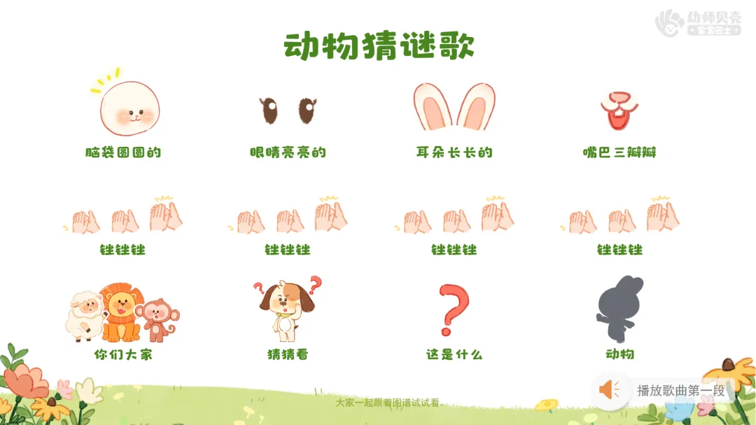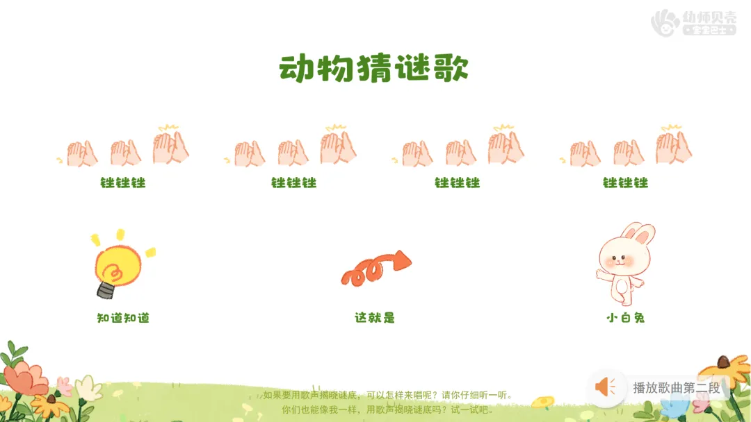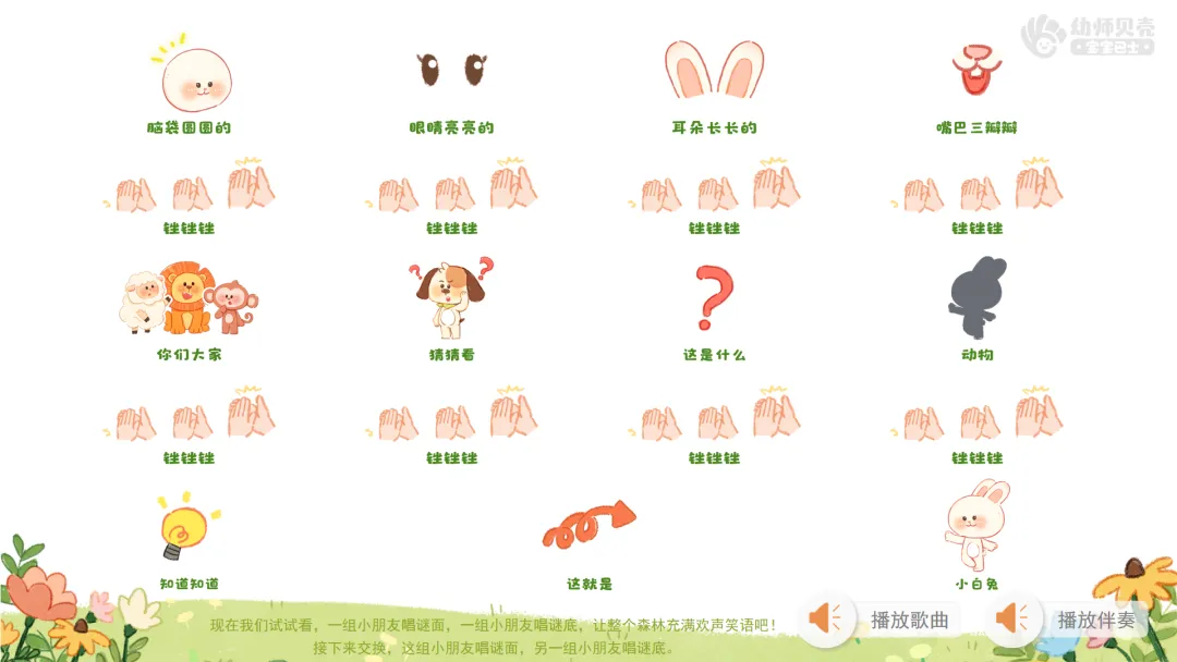 2)播放歌曲音频,鼓励幼儿跟随音乐说唱谜面。