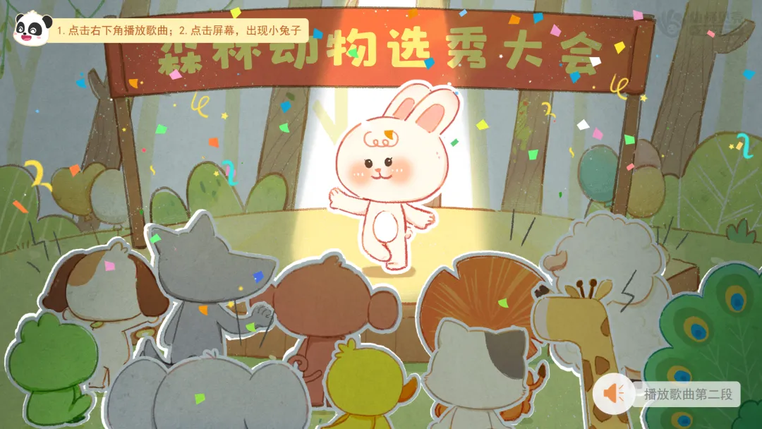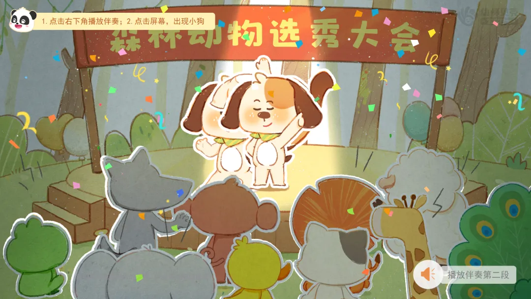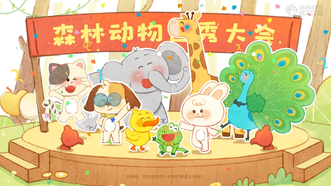 ——森林里面可能还有其他动物想要参加选秀大会呢,大家可以去音乐区里再玩一玩,期待你们能邀请更多小动物,带来更多精彩的表演!