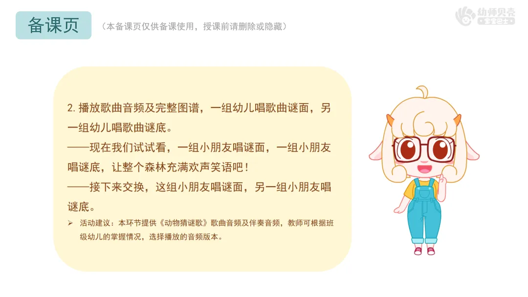 Ø活动建议:本环节提供《动物猜谜歌》歌曲音频及伴奏音频,教师可根据班级幼儿的掌握情况,选择播放的音频版本。