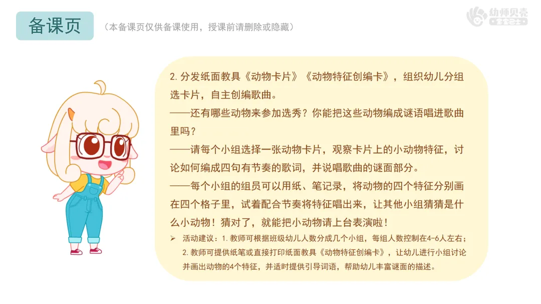 Ø活动建议:1.教师可根据班级幼儿人数分成几个小组,每组人数控制在4-6人左右;2.教师可提供纸笔或直接打印纸面教具《动物特征创编卡》,让幼儿进行小组讨论并画出动物的4个特征,并适时提供引导词语,帮助幼儿丰富谜面的描述。
