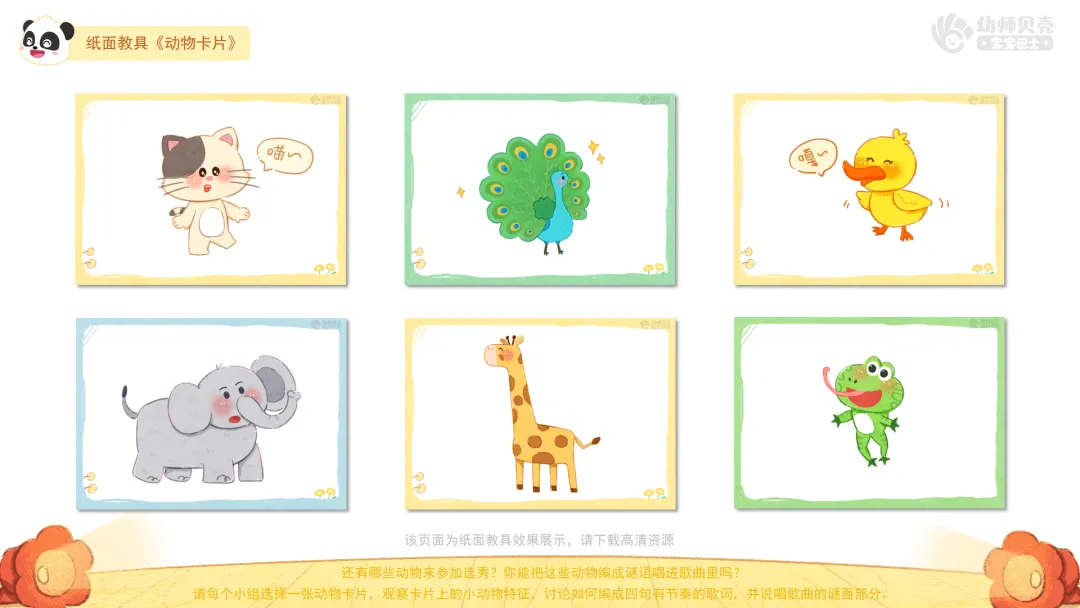 ——请每个小组选择一张动物卡片,观察卡片上的小动物特征,讨论如何编成四句有节奏的歌词,并说唱歌曲的谜面部分。