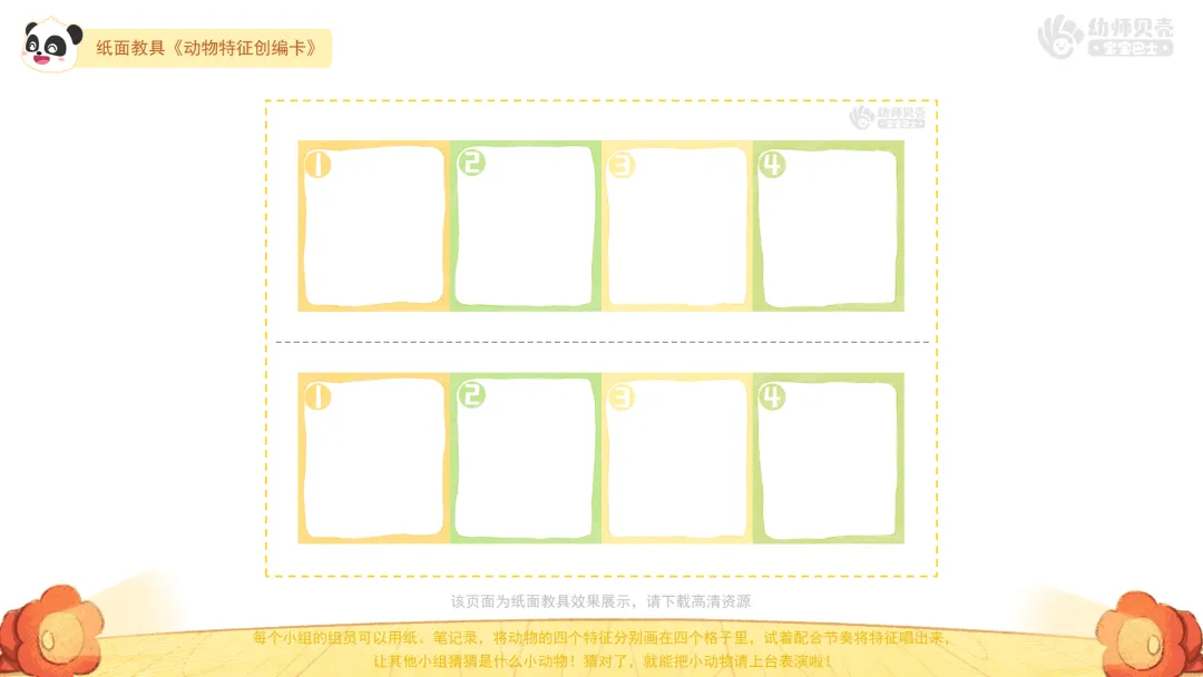 ——每个小组的组员可以用纸、笔记录,将动物的四个特征分别画在四个格子里,试着配合节奏将特征唱出来,让其他小组猜猜是什么小动物!猜对了,就能把小动物请上台表演啦!