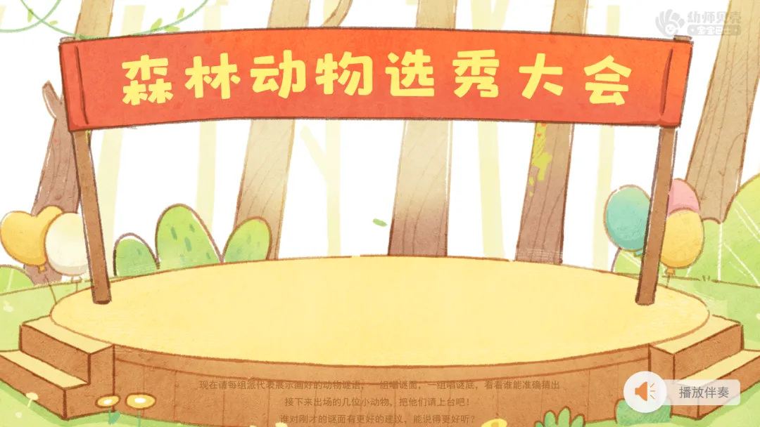 ——现在我们试试看,一组小朋友唱谜面,一组小朋友唱谜底,让整个森林充满欢声笑语吧!