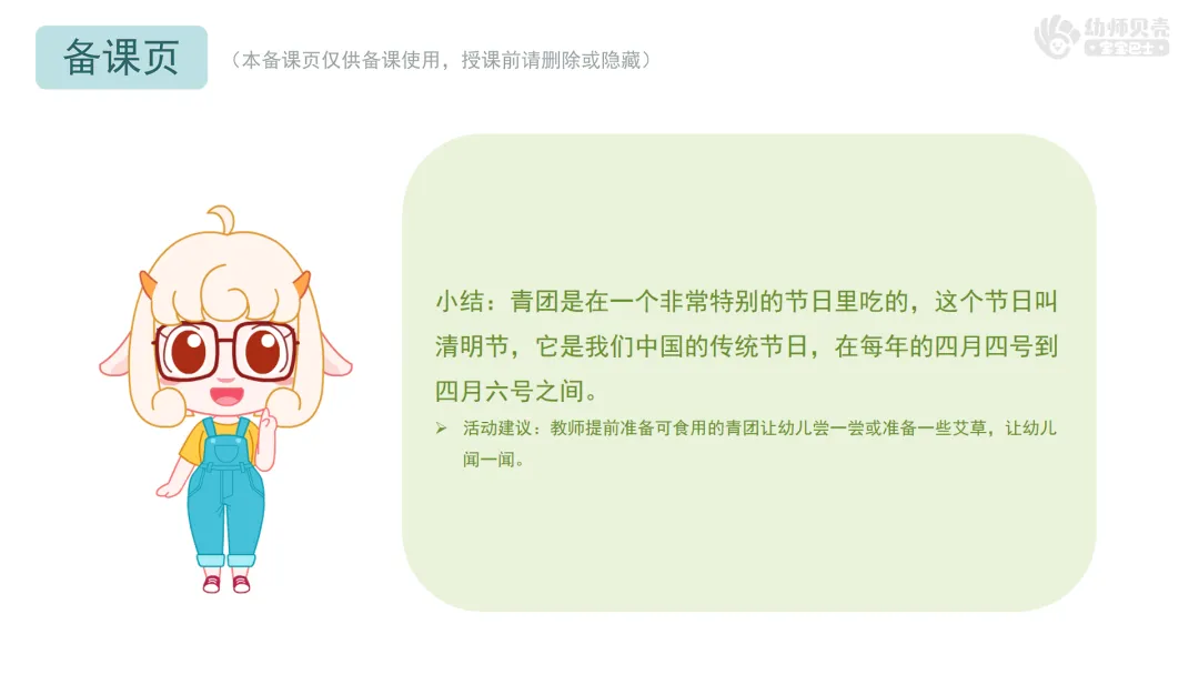 小结:青团是在一个非常特别的节日里吃的,这个节日叫清明节,它是我们中国的传统节日,在每年的四月四号到四月六号之间。