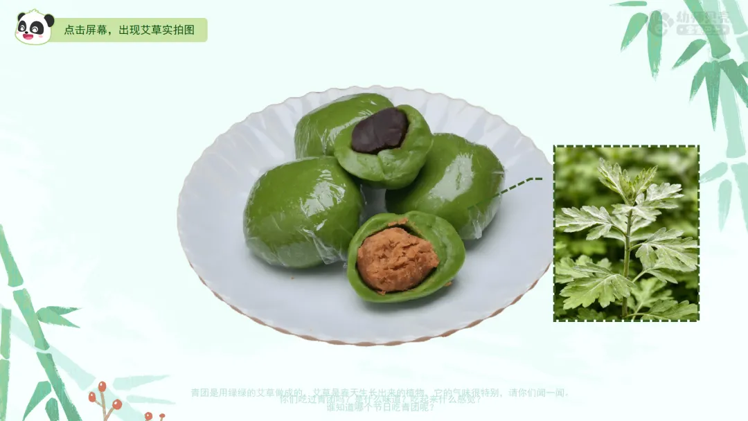 Ø活动建议:教师提前准备可食用的青团让幼儿尝一尝或准备一些艾草,让幼儿闻一闻。