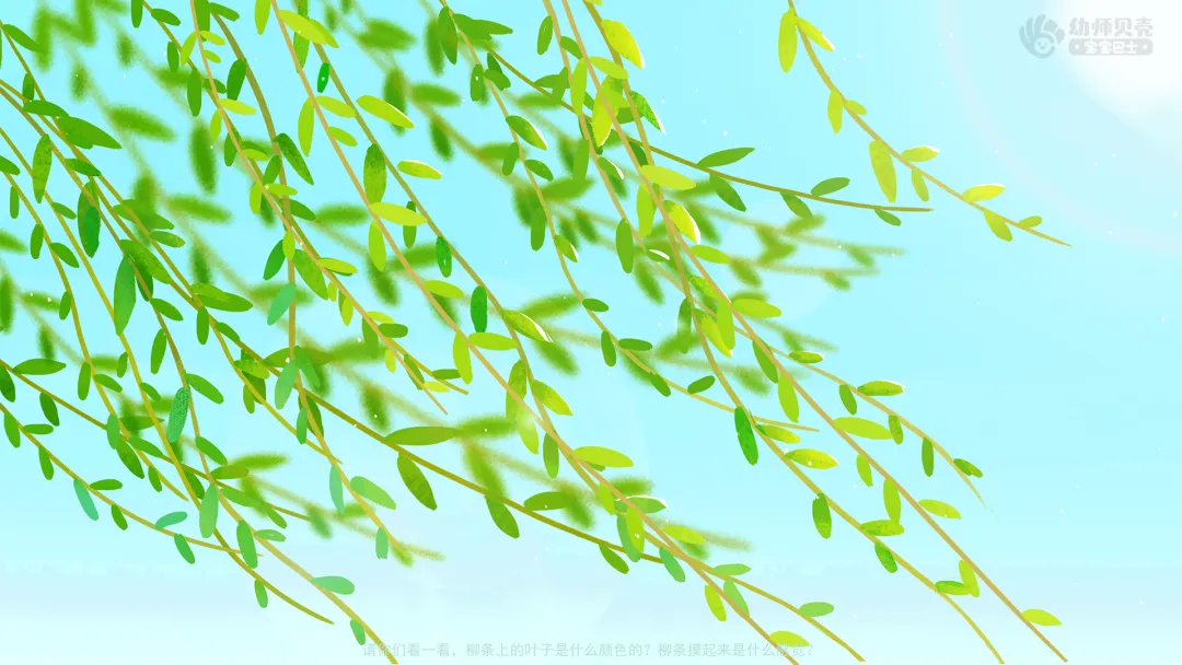 ——请你们看一看,柳条上的叶子是什么颜色的?柳条摸起来是什么感觉?