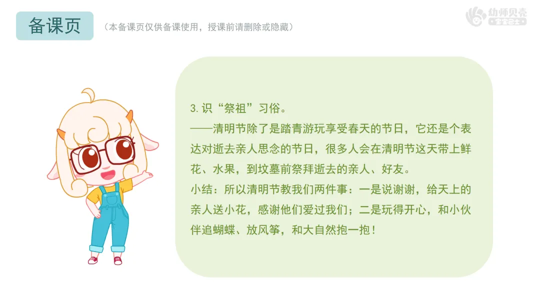小结:所以清明节教我们两件事:一是说谢谢,给天上的亲人送小花,感谢他们爱过我们;二是玩得开心,和小伙伴追蝴蝶、放风筝,和大自然抱一抱!