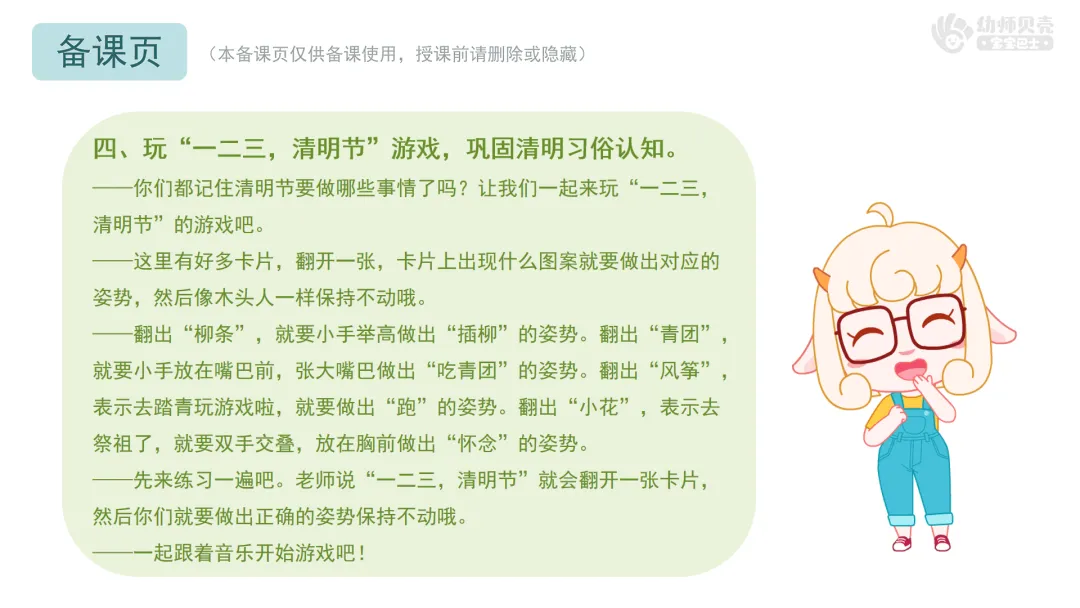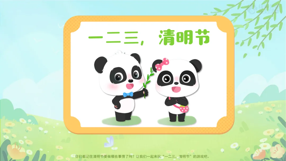 ——你们都记住清明节要做哪些事情了吗?让我们一起来玩“一二三,清明节”的游戏吧。