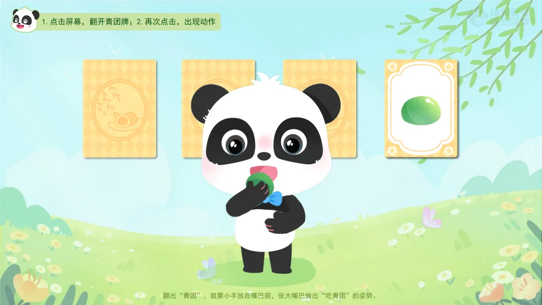 ——翻出“青团”,就要小手放在嘴巴前,张大嘴巴做出“吃青团”的姿势。
