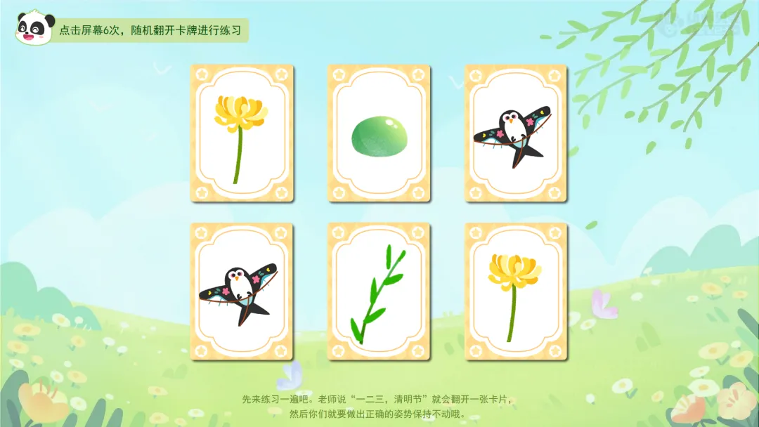 ——先来练习一遍吧。老师说“一二三,清明节”就会翻开一张卡片,然后你们就要作出正确的姿势保持不动哦。