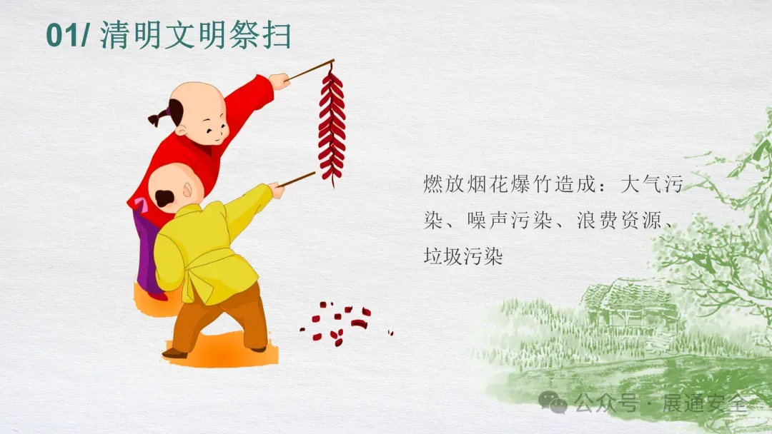 严格遵守当地祭扫规定,不违规燃放烟花爆竹、不焚烧纸钱、冥币等易燃易爆物品;优先选择鲜花祭扫、绿植祭扫、线上祭扫等文明环保方式,减少火灾隐患。