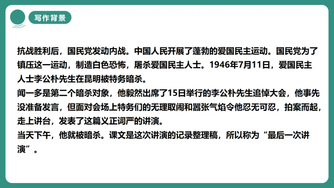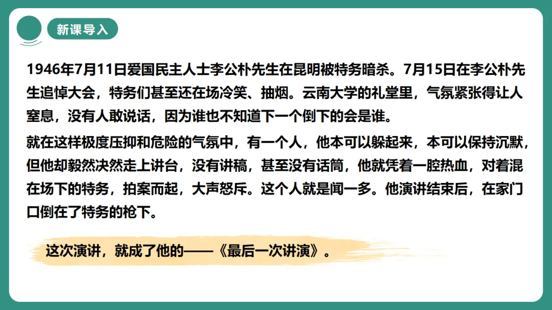 2.掌握“李公朴事件”的背景,理解演讲的历史语境。