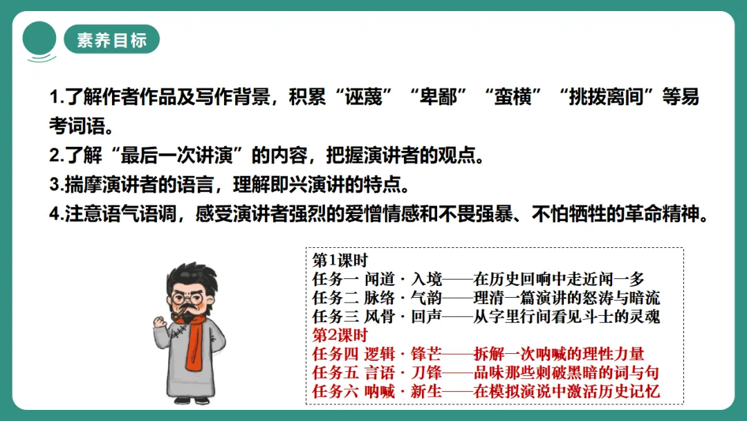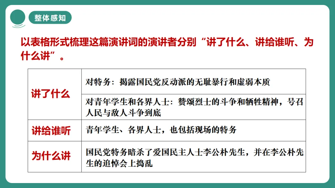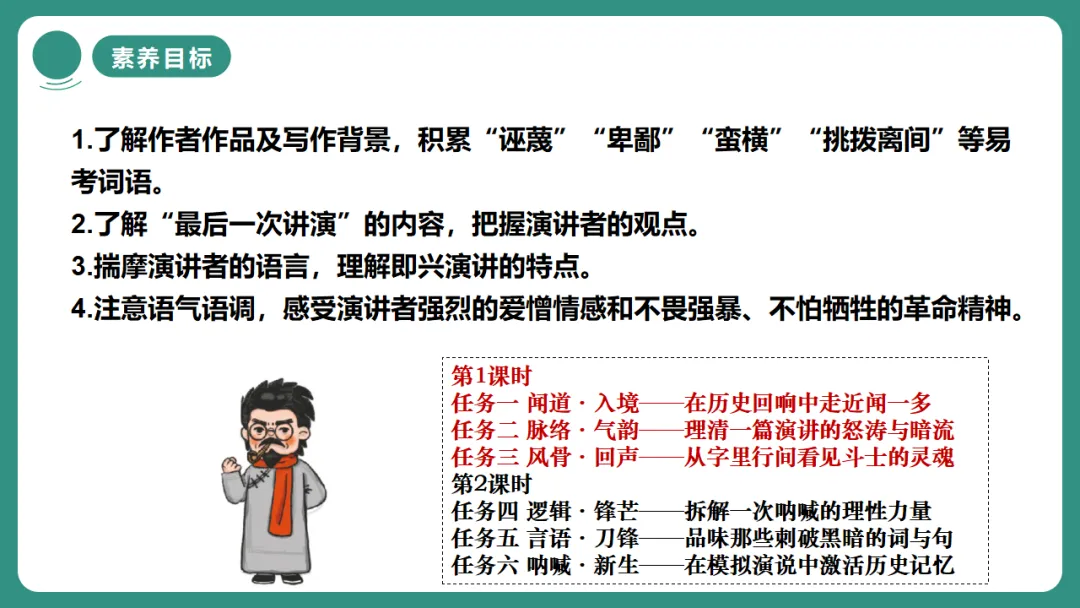 2.了解“最后一次讲演”的内容,把握演讲者的观点。