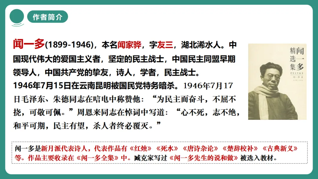 1.了解闻一多的生平、创作及作为民主战士的主要事迹。