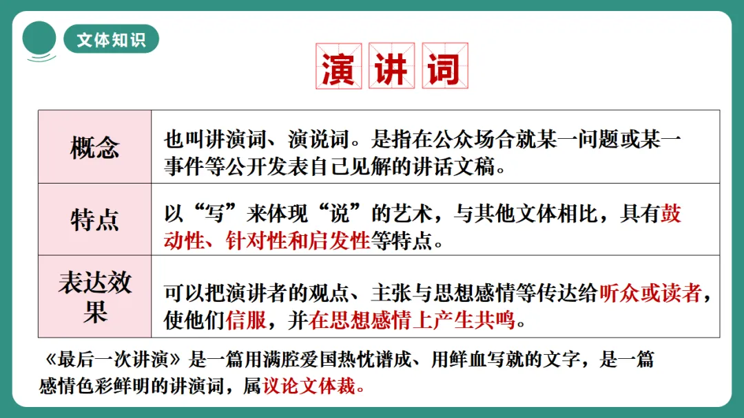 《最后一次讲演》是一篇用满腔爱国热忱谱成、用鲜血写就的文字,是一篇感情色彩鲜明的讲演词,属议论文体裁。